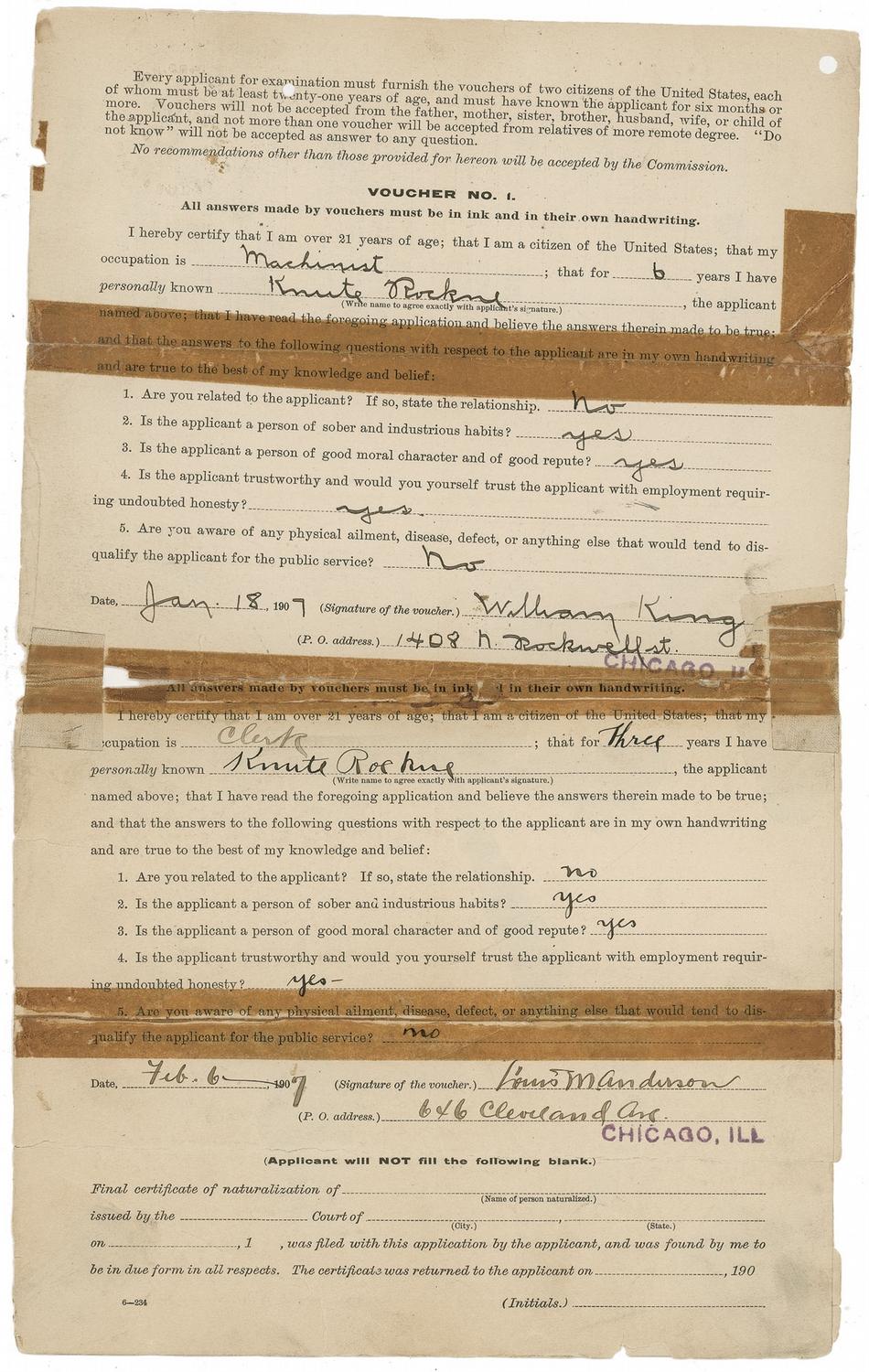 The second page of the application bears two personal vouchers, filled out by acquaintances of Rockne attesting to his information and character, with questions including “Is the applicant a person of sober and industrious habits?,” and “Is the applicant a person of good moral character and of good repute?” This page is signed on the docket by Rockne, who has also added several other lines of information.