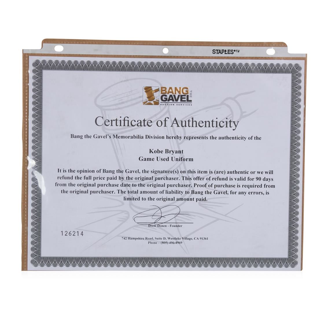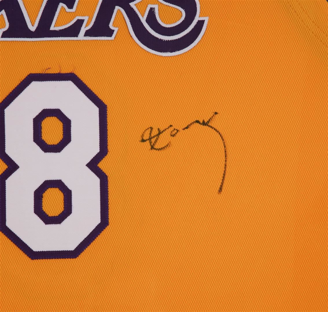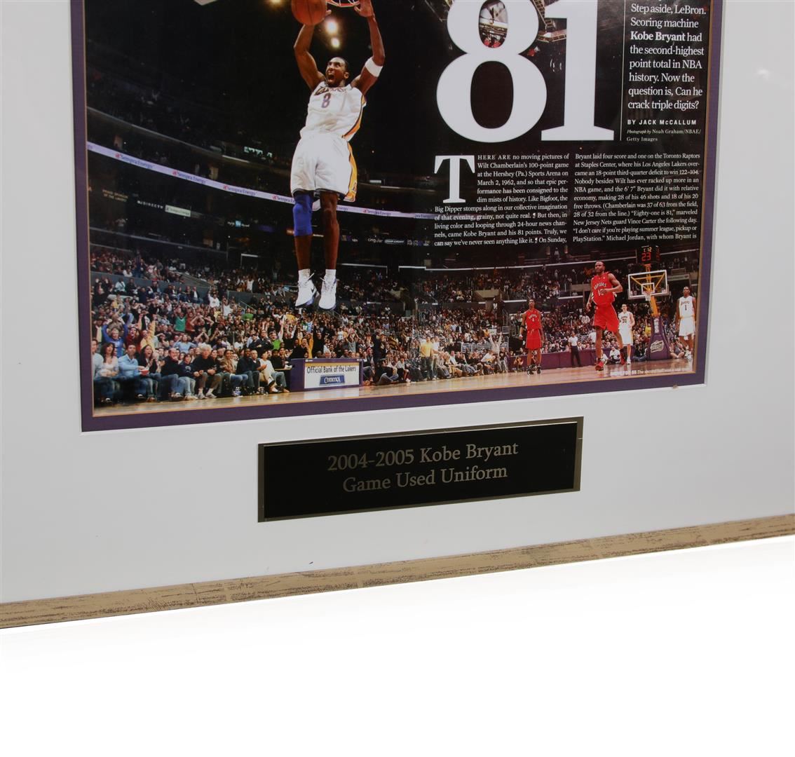 This collage features an original game used uniform of Los Angeles Lakers legend Kobe Bryant who started of his career with the Lakers as #8. All proper game used tags are attached . Framed 40" x 80" framed.
