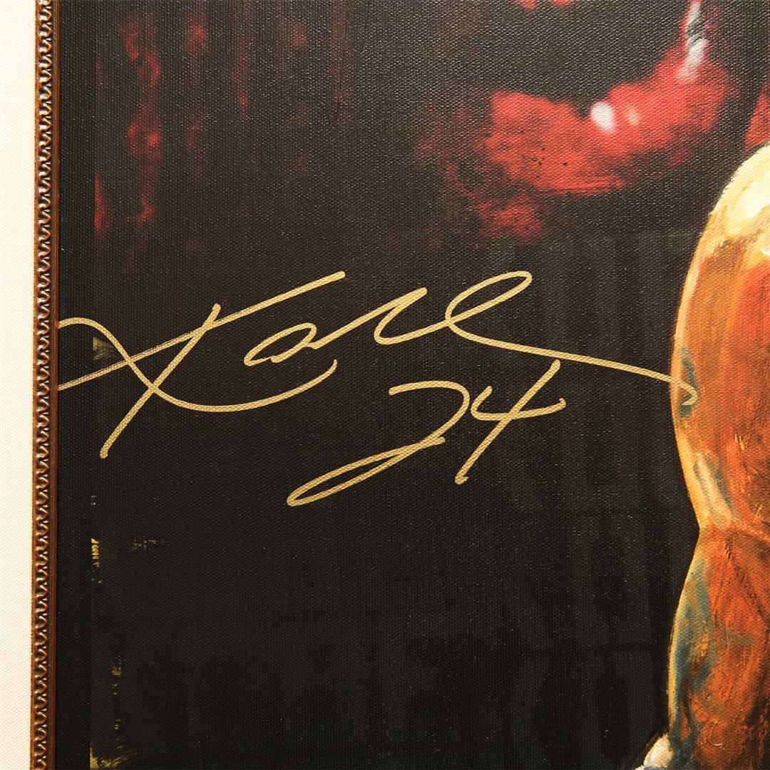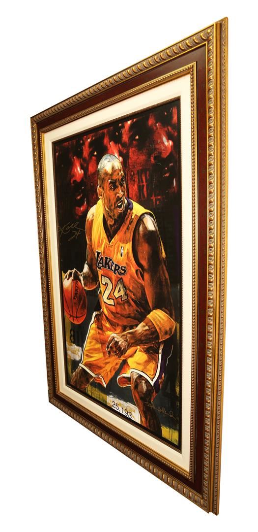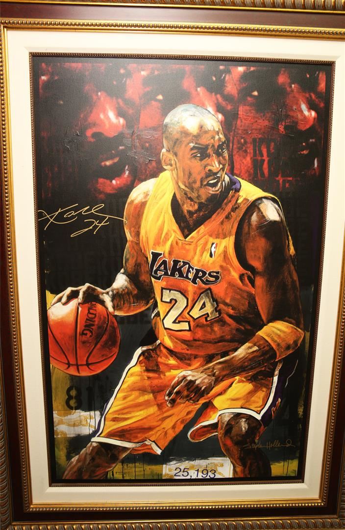 A Kobe Bryant autographed Giclee authenticated by All Authentic and signed by the Artist Stephen Holland. Frame measures 55.5" tall x 41" wide, visible area of Giclee measures 44" tall x 28" wide.