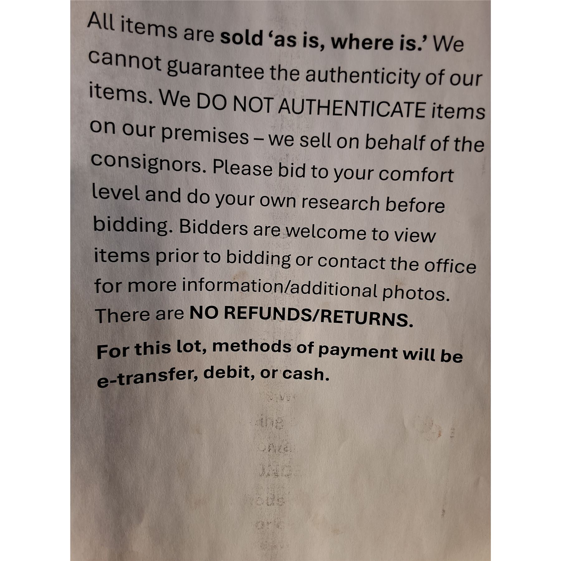 A online bidding premium may be applied to each lot purchased on the Internet. Federal GST and corresponding Provincial Sales Tax will apply to all purchases where applicable.