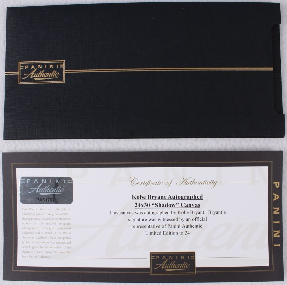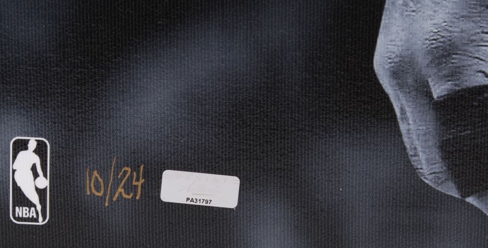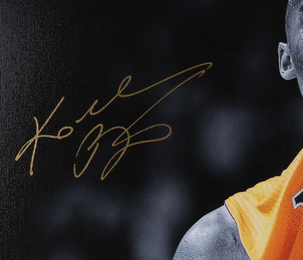 Canvas measures 24" x 30" in size and is hand-signed in gold paint pen by Kobe Bryant (Lakers). The piece is gallery stretched and ready to hang. Autograph is hand-numbered #10/24. The autograph includes an official Panini hologram and matching COA for authenticity purposes.