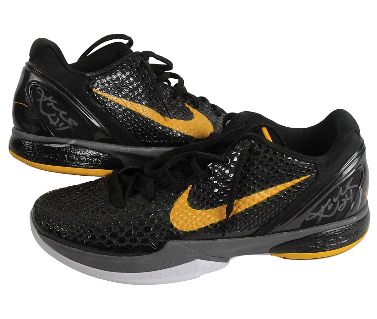 Pair of black and yellow Nike Kobe Bryant shoes, each signed near the heel in silver ink. In overall fine condition.