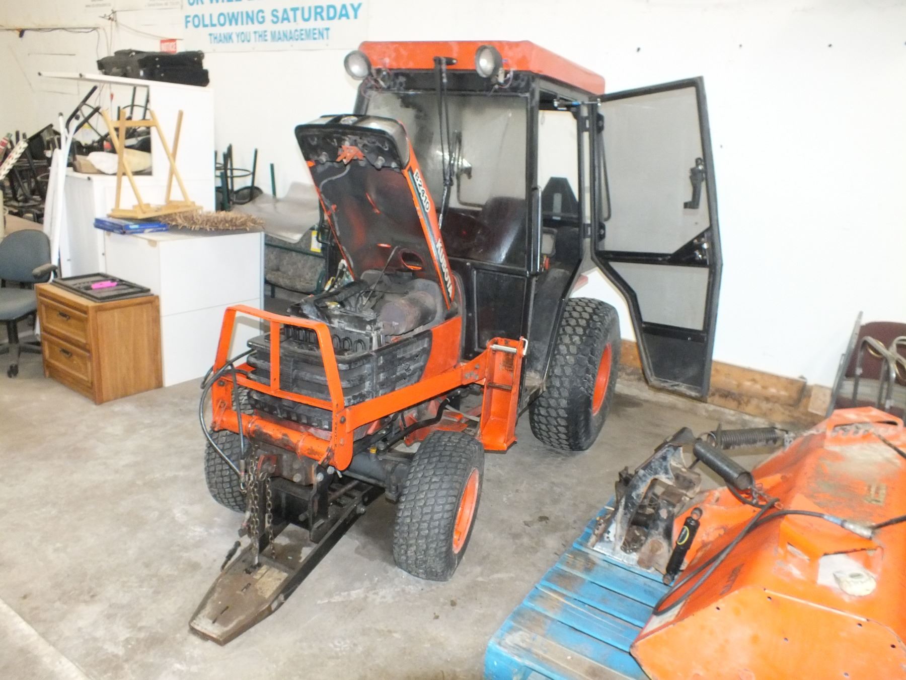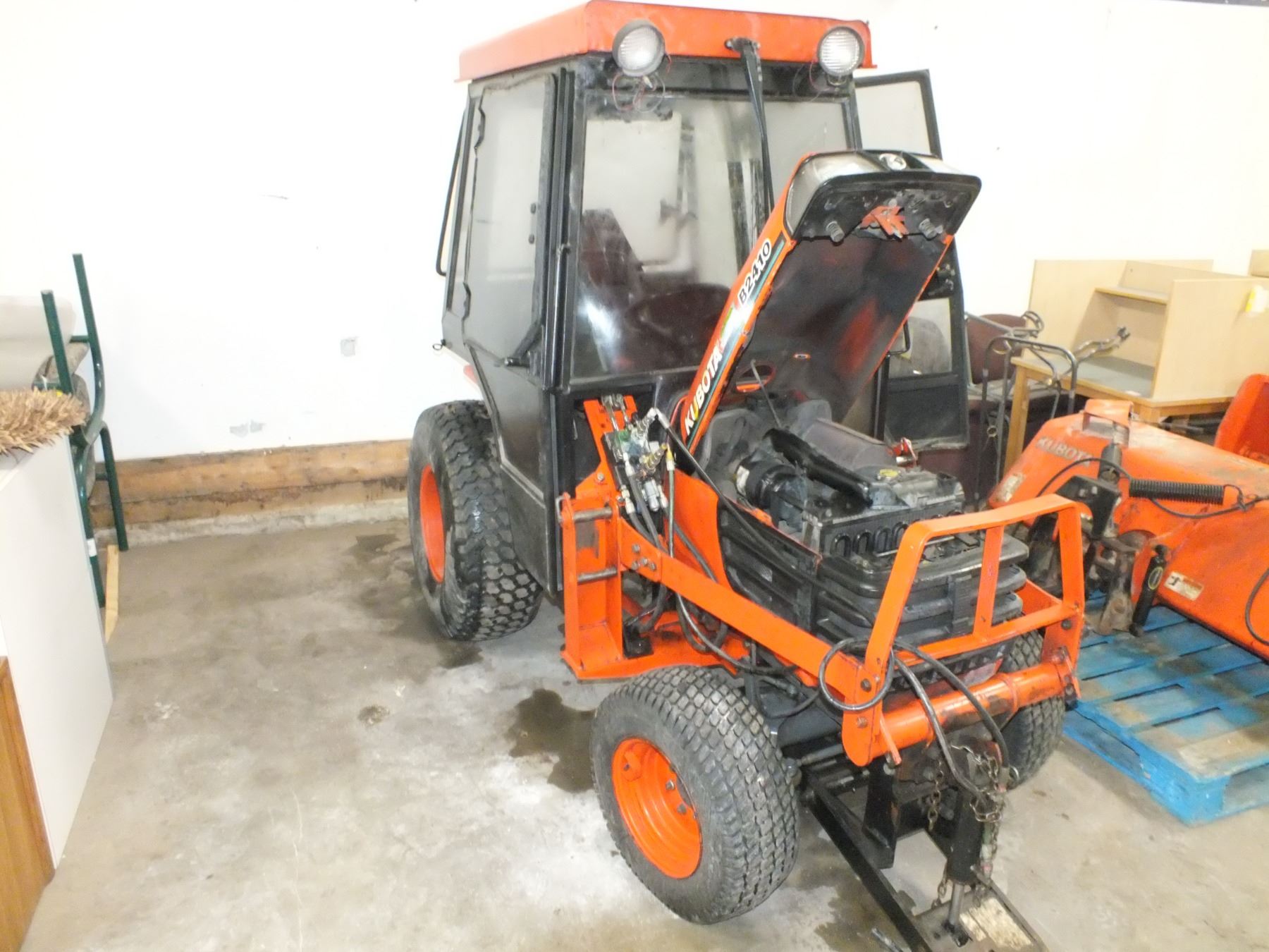 Kobota B2410 Tractor, only has 2207.9 hrs on it, 4x4, 24hp, comes with 1 5ft brush attachment, 50" snow blower attachment, 5ft blade attachment, and a 55" Bucket attachment, has a 3 point hitch, PTO front and back of the tractor, Has a hydraulic Leak that needs fixing, overall in great condition....used