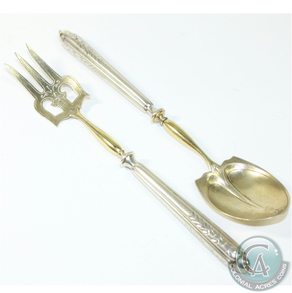 Koch & Bergfeld 800 Silver Fork & Spoon Service Set. Each Piece measures 8" in length and have been hand chased and enhanced with gold plating. Total weight of both pieces is 76.03 grams. 2pcs.