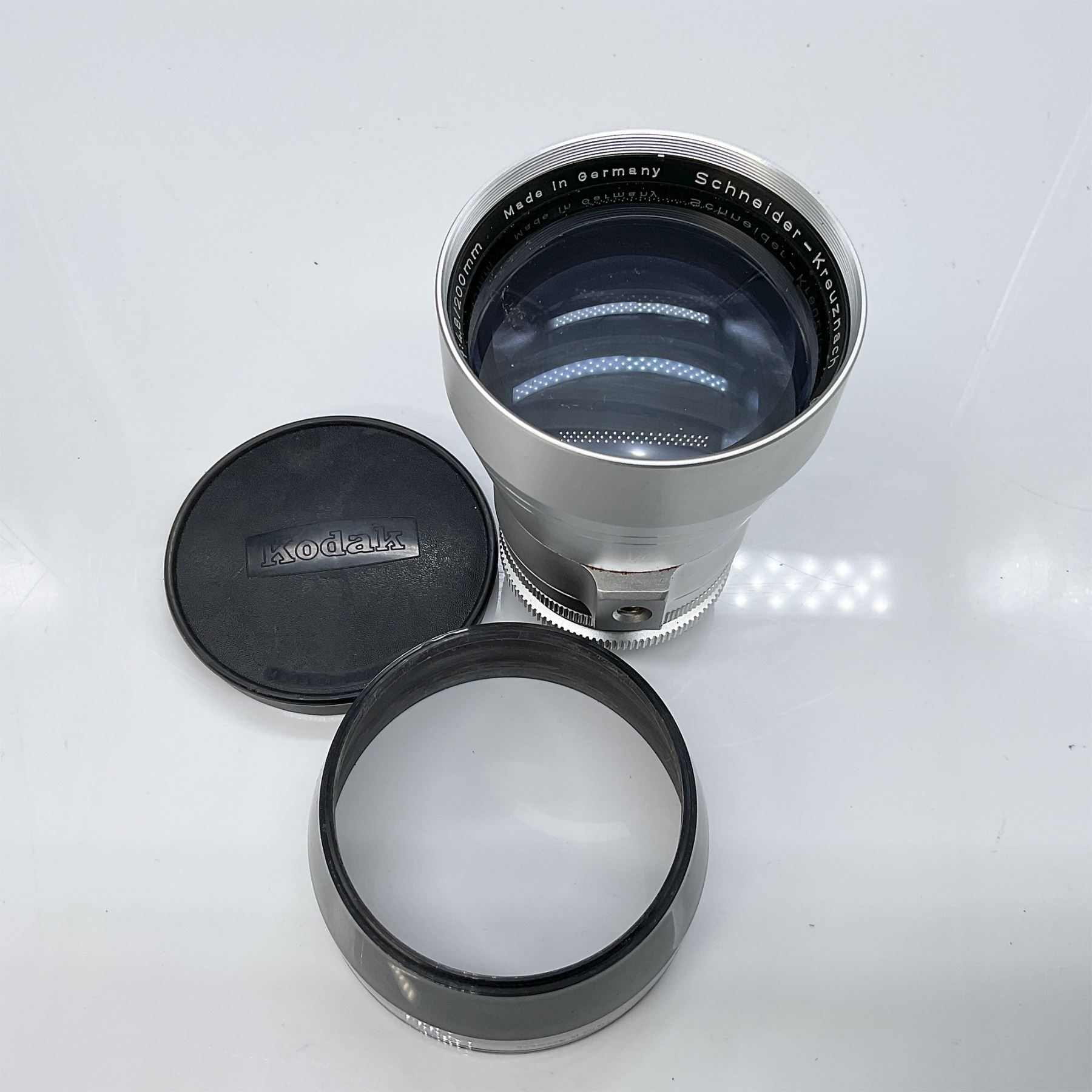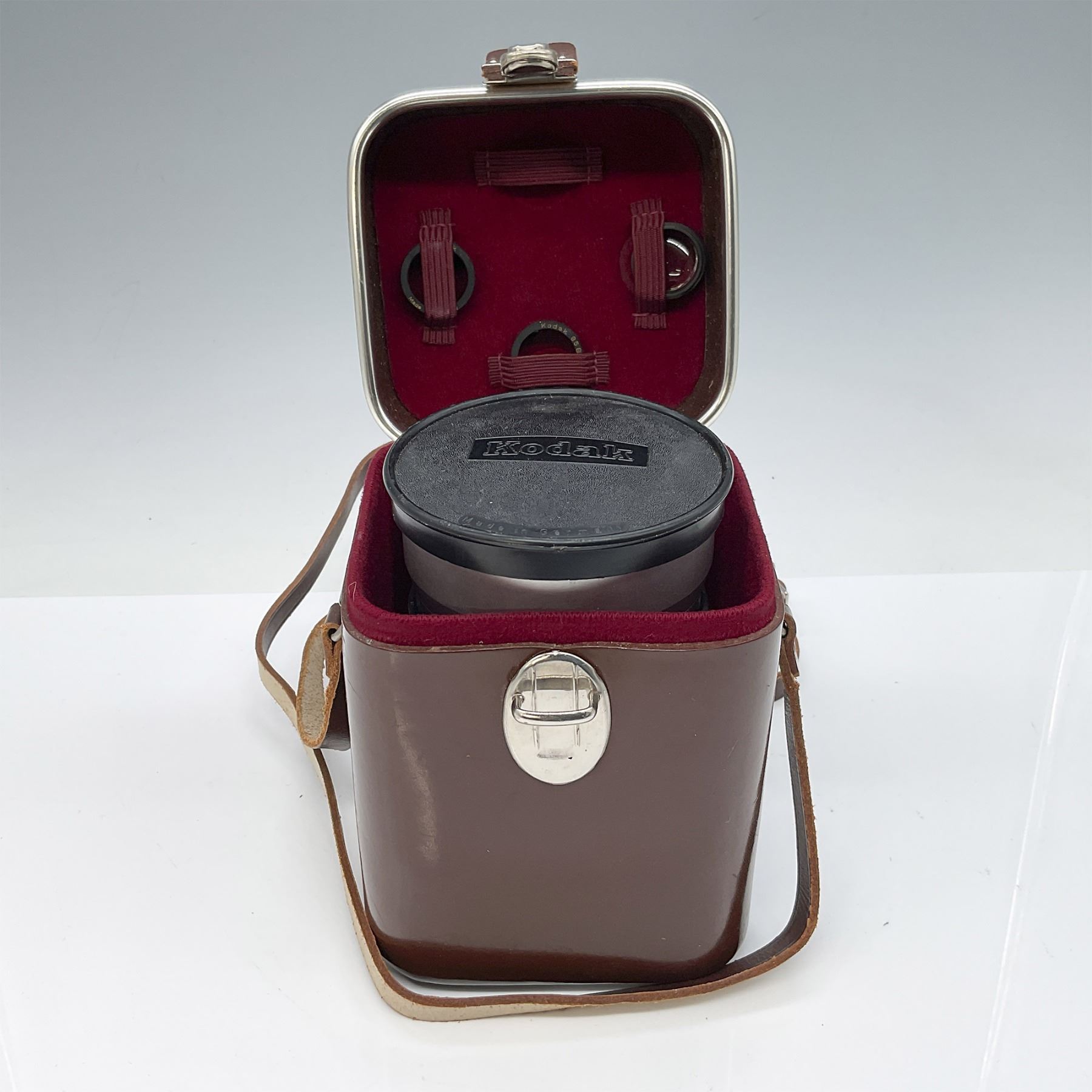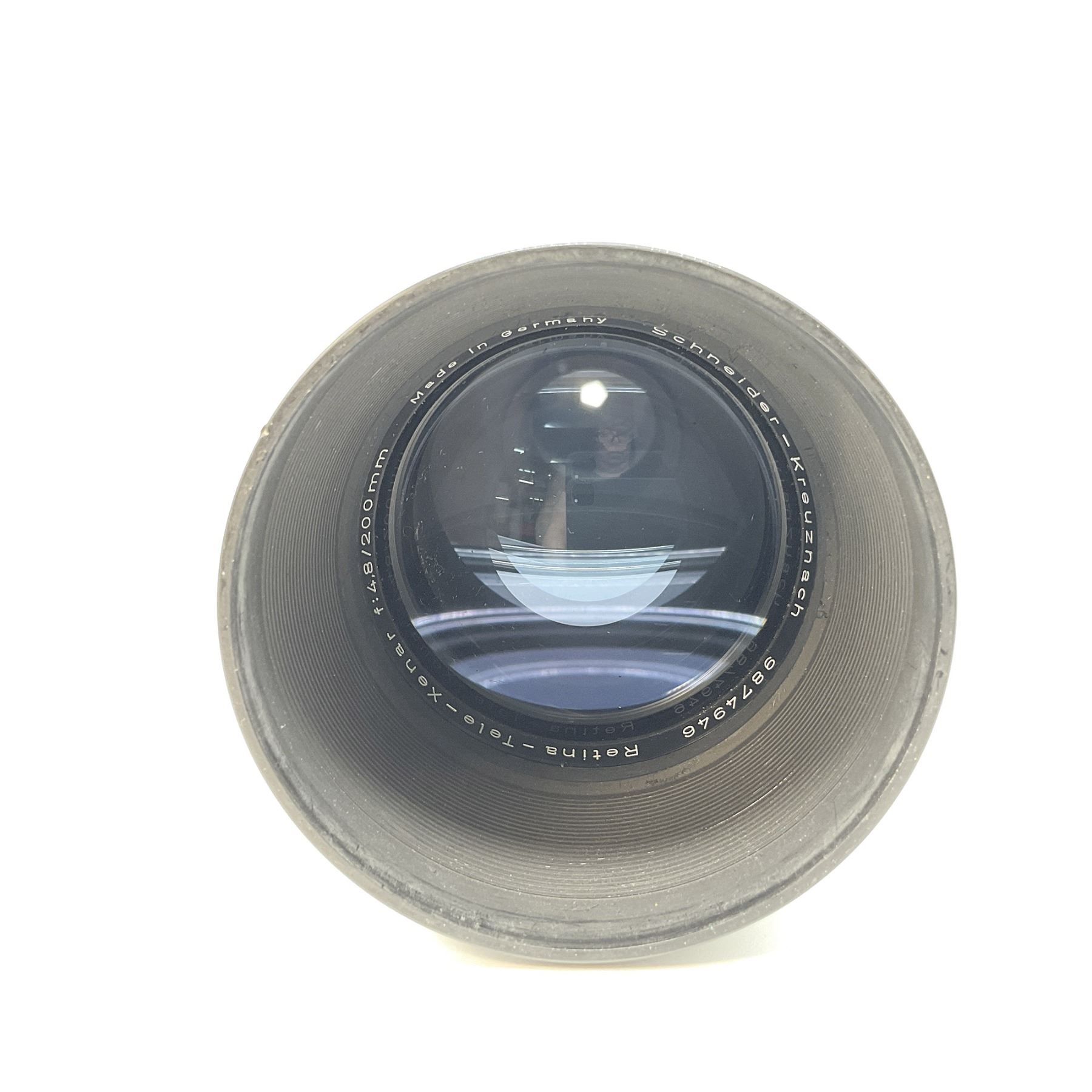 This vintage set includes a Kodak 200mm camera lens, a Schneider-Kreuznach Retina-Tele-Xenar f/4.8 lens, made in Germany, with serial number 987496. The set also features the original Kodak-branded metal lens hood, a protective lens cap, and a vintage brown leather carrying case with a red velvet interior and adjustable strap. The case measures 5.5 inches in height and includes fitted compartments and elastic bands to securely store the lens and its accessories. This set is ideal for photography enthusiasts or collectors seeking vintage camera equipment with both functional and aesthetic appeal. This lens is designed for capturing distant subjects with precision, making it perfect for nature, wildlife, or portrait photography. Compatible with vintage camera systems, it offers a classic photography experience, appealing to those who appreciate the craftsmanship of mid-20th-century optics. The lens exterior shows minimal wear consistent with its age and use. The optics appear clear with no visible cracks, although some dust particles are present and may require cleaning for optimal performance. The leather case is in good vintage condition, with functional clasps and minor signs of wear. This unique lot offers a nostalgic glimpse into vintage photography and would make a fine addition to any camera or optics collection.