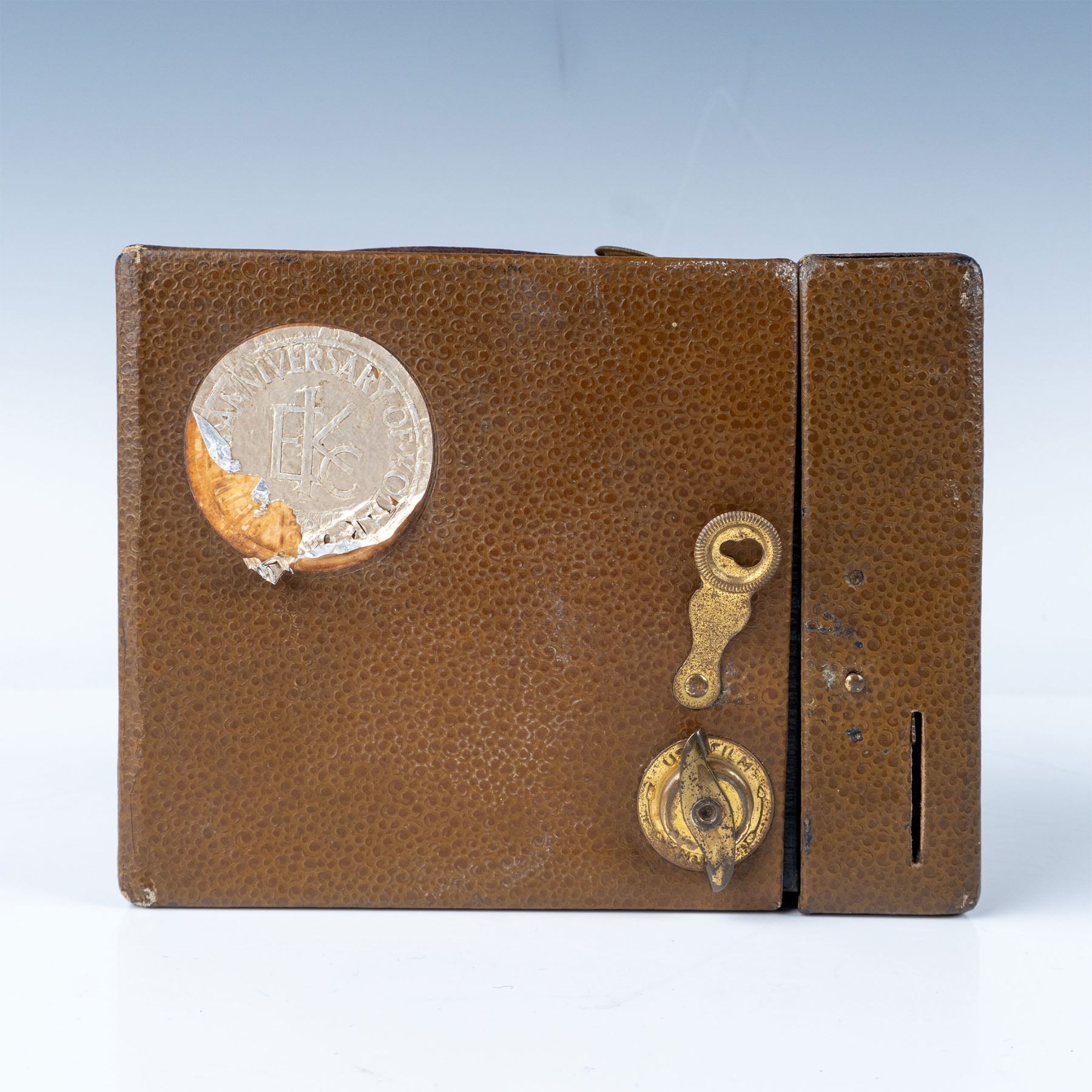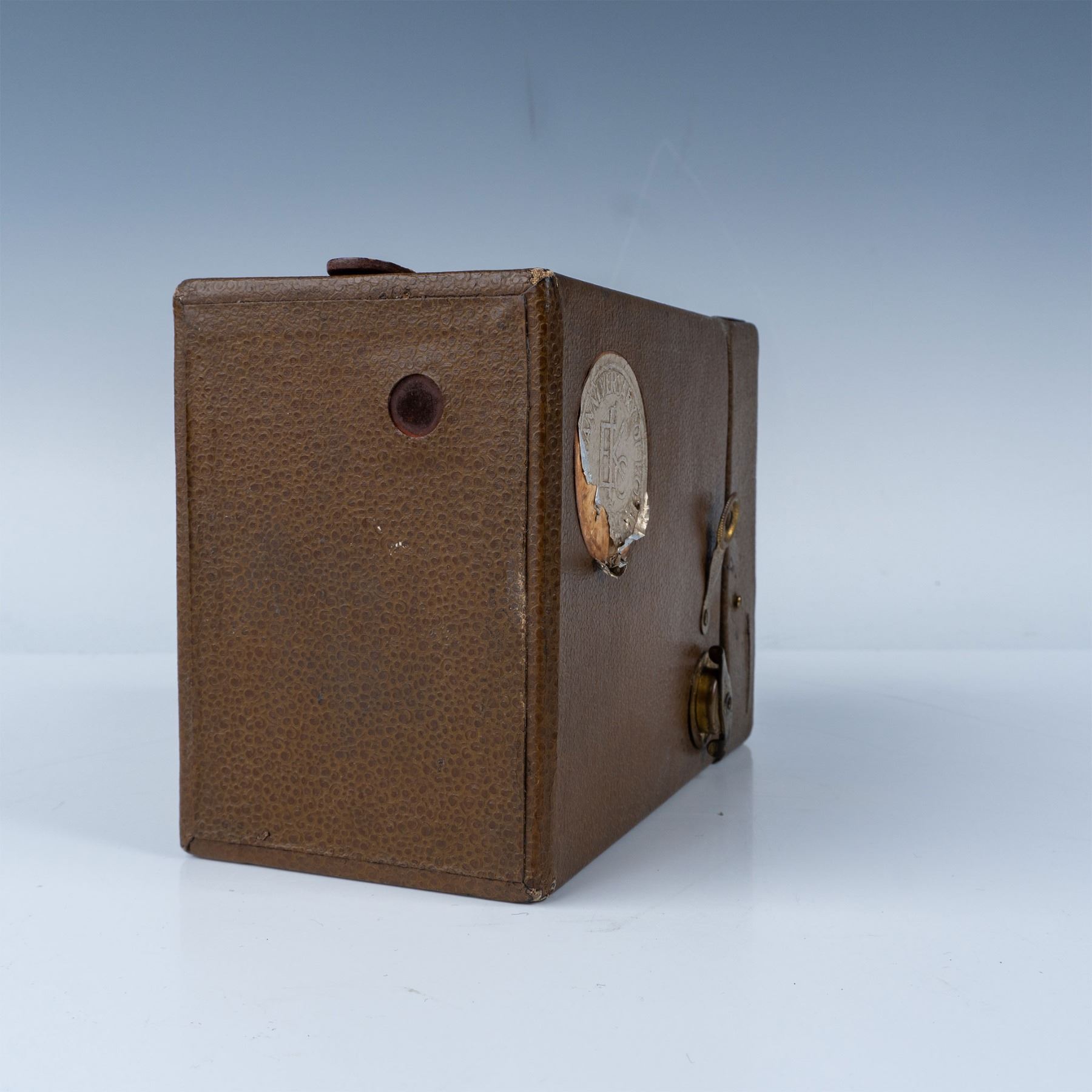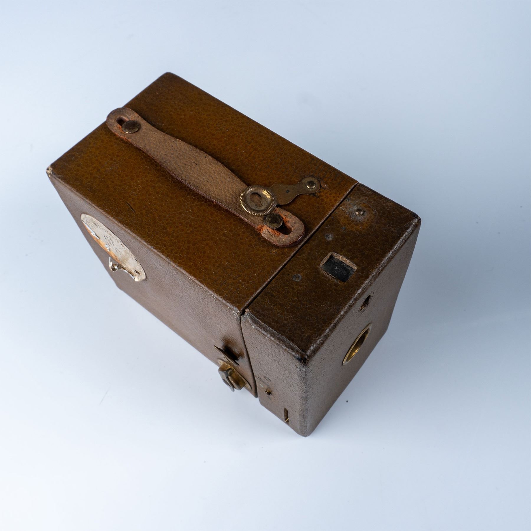A collectible Kodak No. 2 Model C box camera, made to commemorate Kodak's 50th Anniversary. This classic piece of photographic history is encased in brown textured leatherette with a gold-colored emblem marking Kodak’s 50th anniversary. The camera is equipped with a leather carrying strap, a key mechanism for operation, and its original gold-colored hardware.