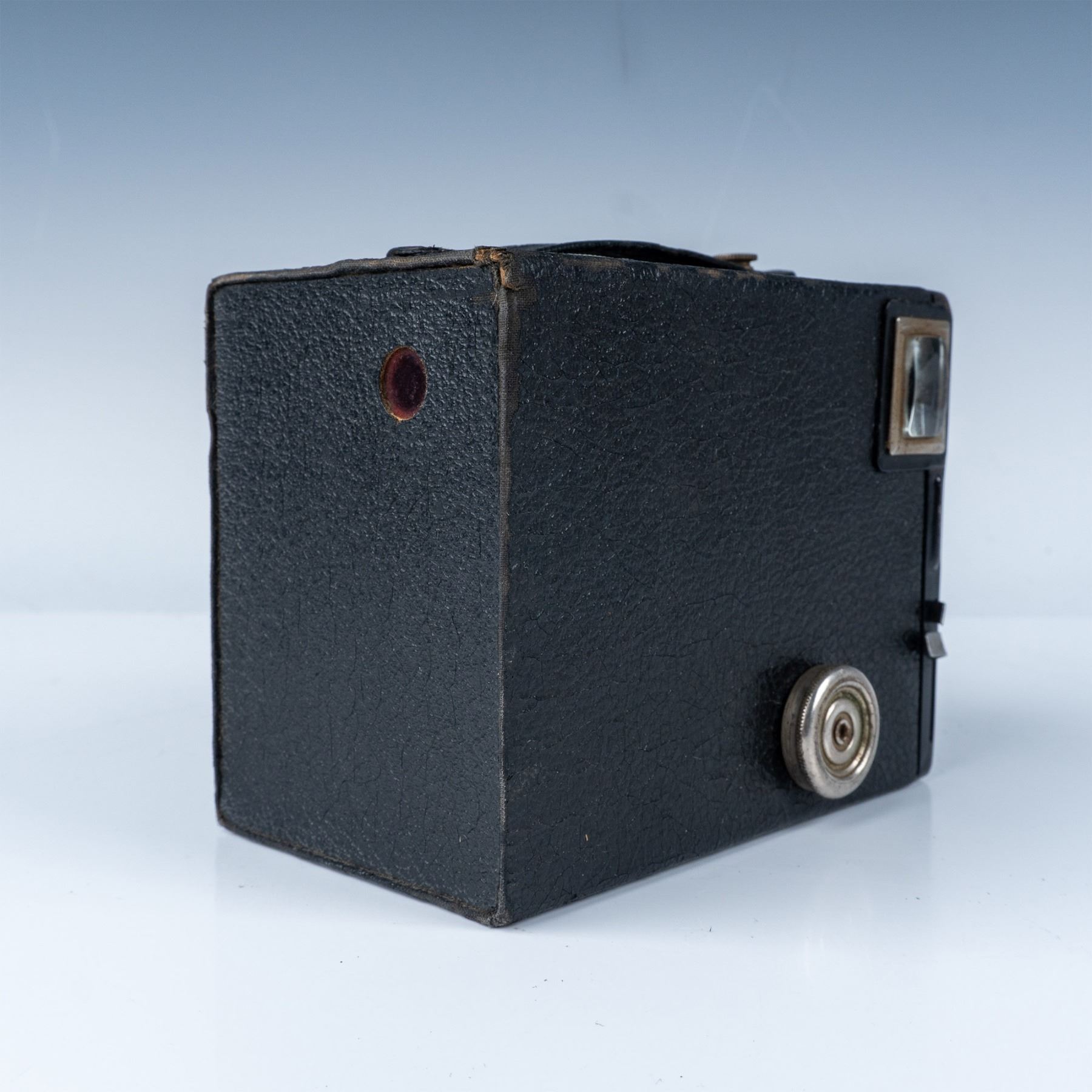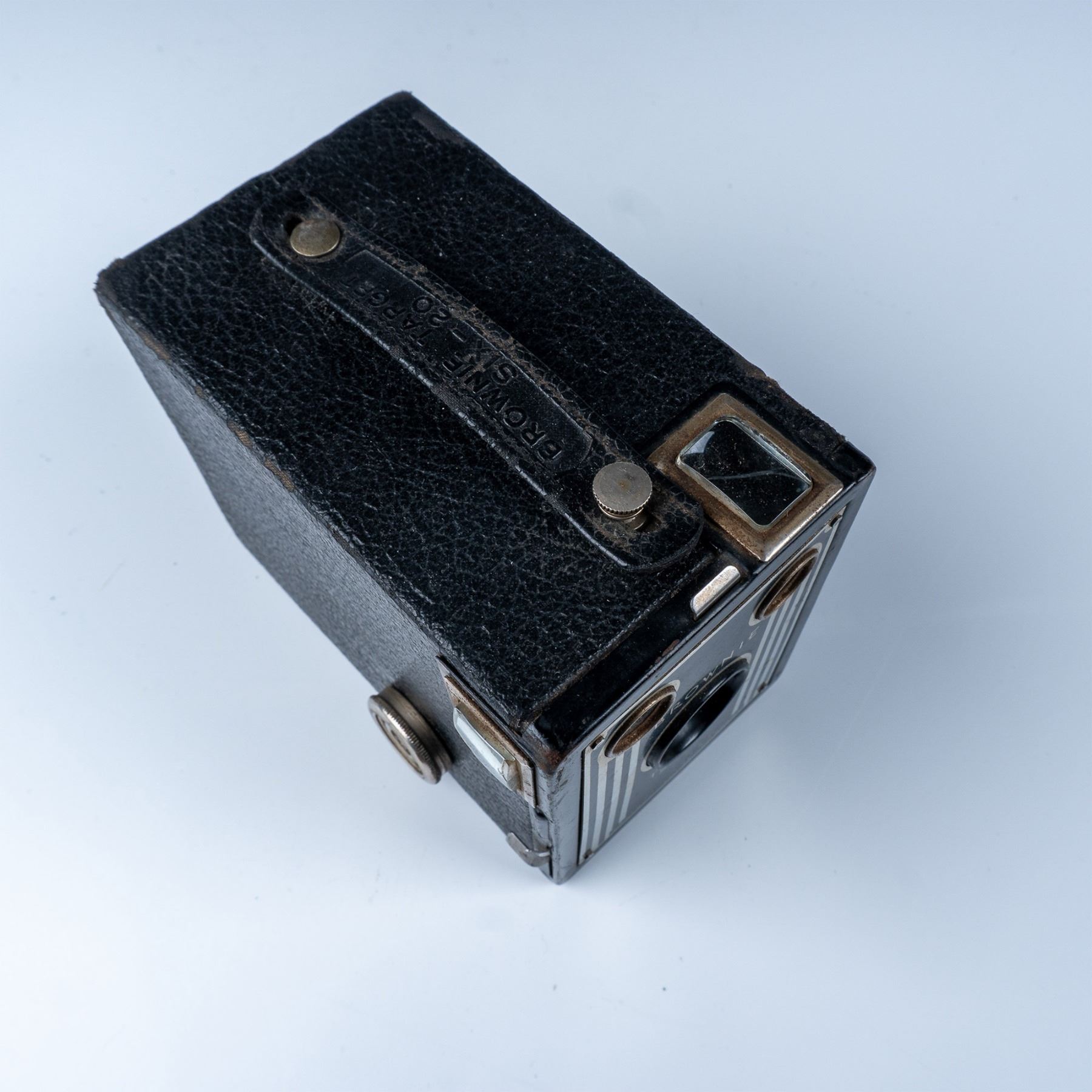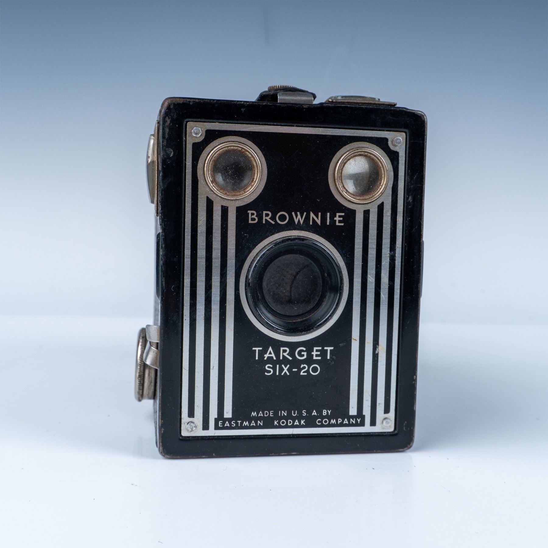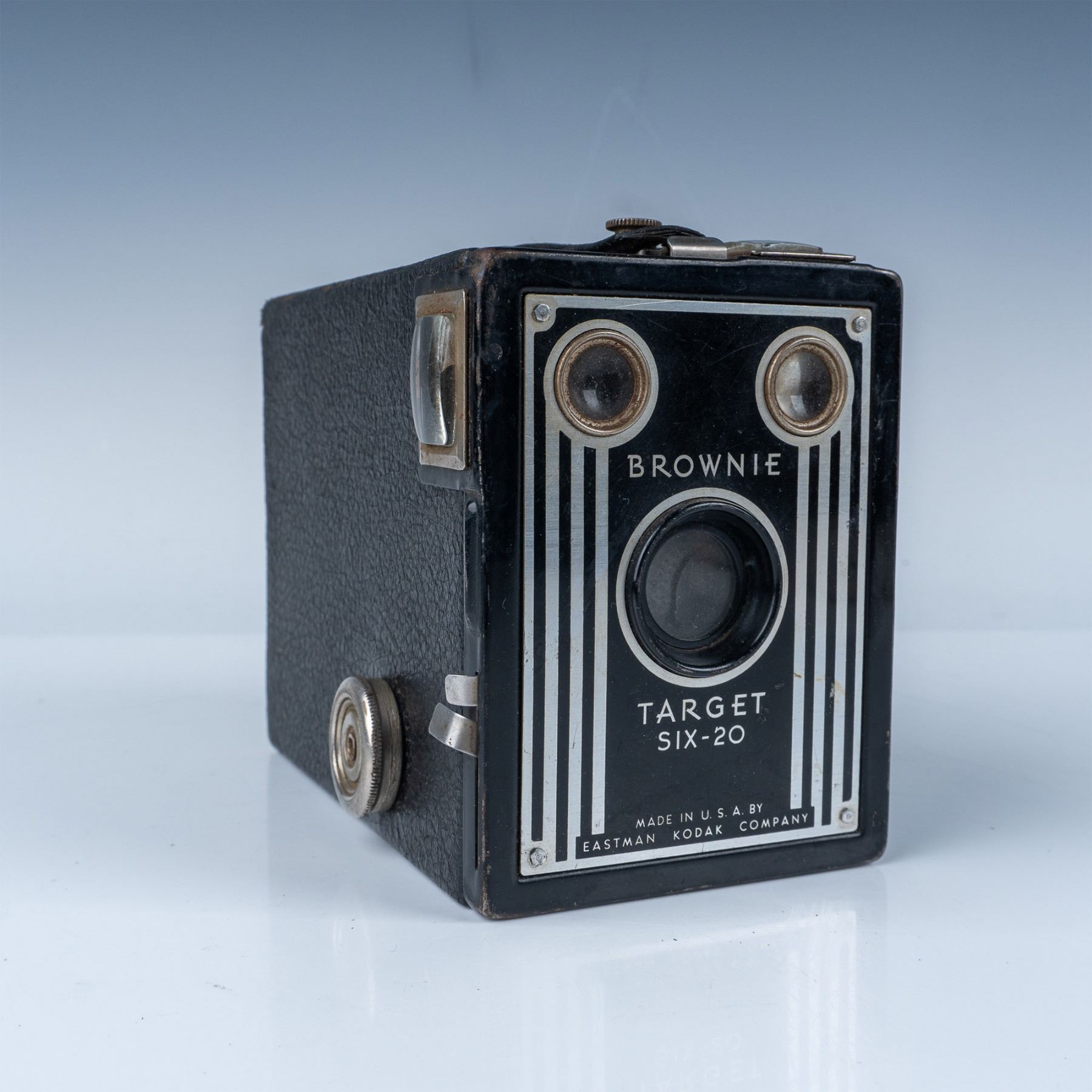 Vintage Kodak Brownie Target Six-20 box camera, manufactured by Eastman Kodak Company in the United States. This camera features a classic Art Deco-inspired design on the front panel with dual metal eyelets for securing a strap. The Brownie series, introduced in the early 20th century, is iconic for making photography accessible to the public. The Target Six-20 model was produced between 1946 and 1952 and is known for its durable metal body covered in black leatherette.