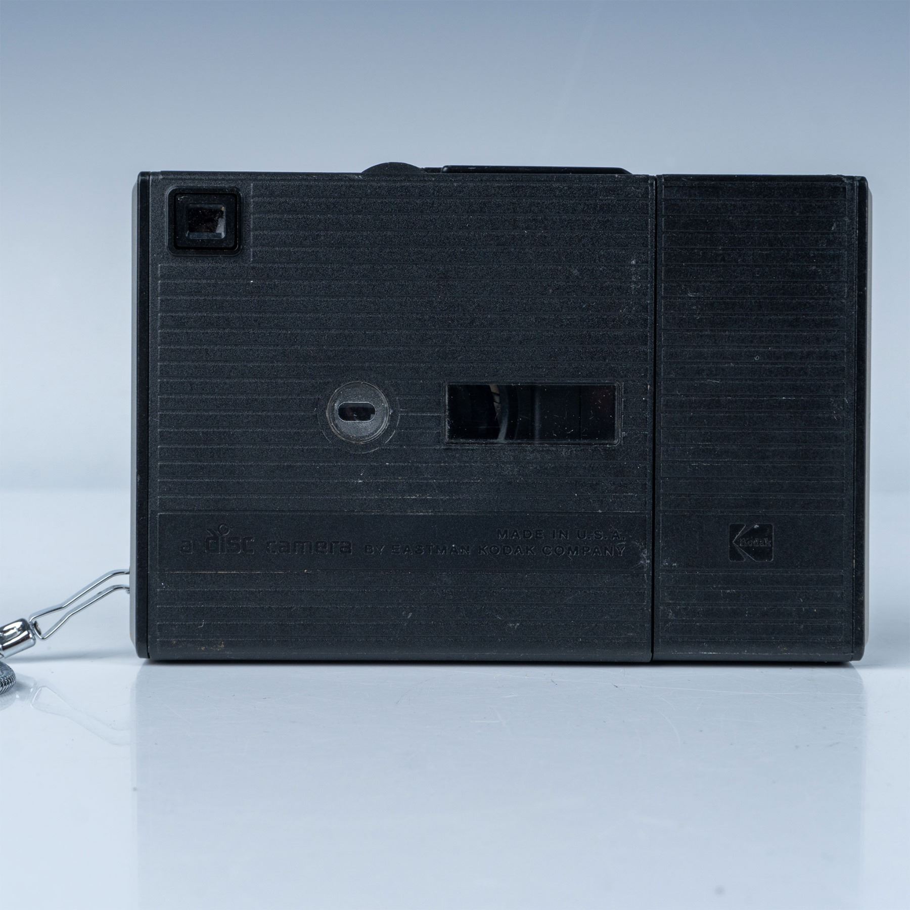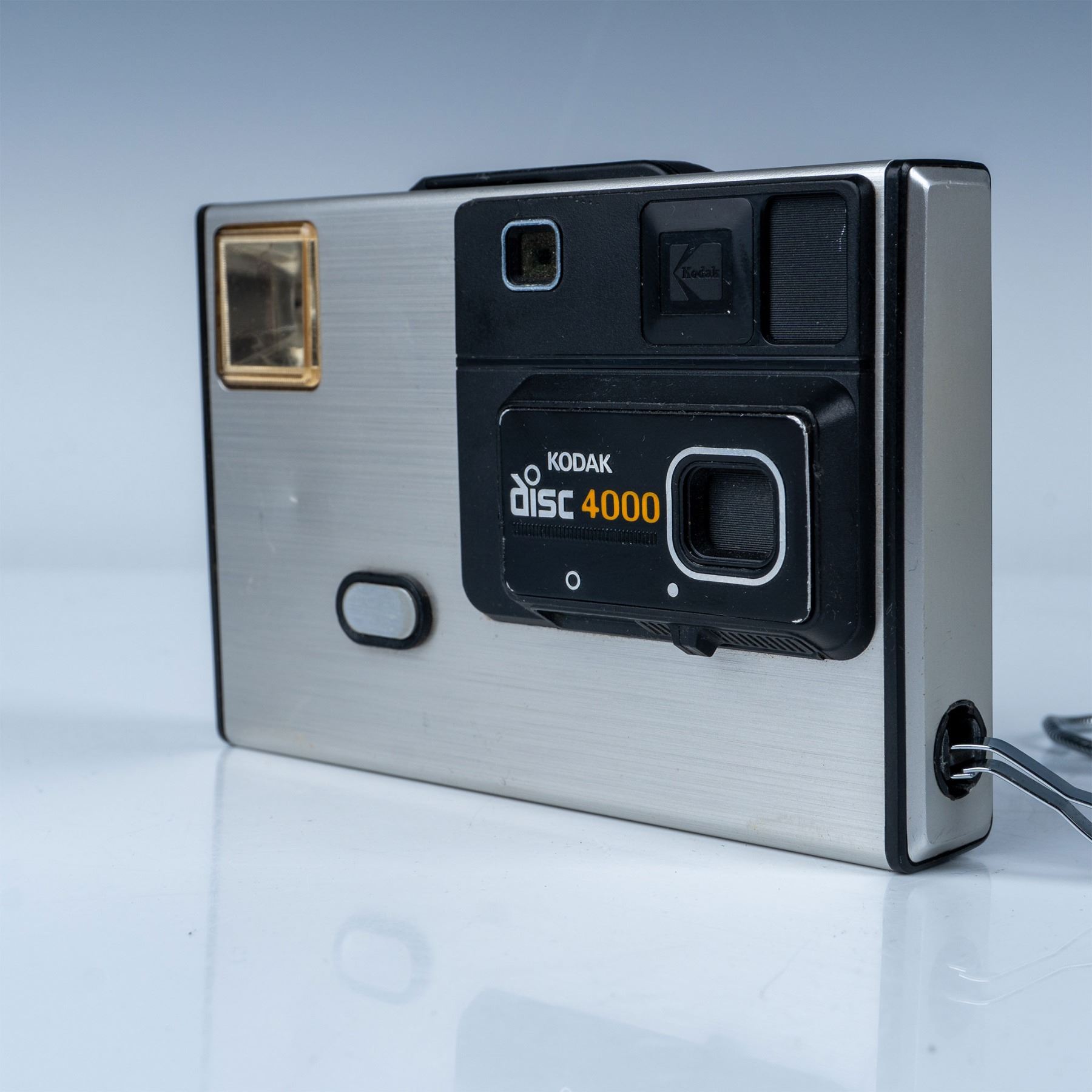 Vintage Kodak Disc 4000 camera, manufactured by Eastman Kodak Company, featuring a sleek silver and black design with built-in flash and wrist strap for portability. This retro camera is an excellent collector's piece, showcasing Kodak's innovative disc film technology from the 1980s. The back of the camera is marked with the Kodak logo and "Made in U.S.A." Compact and lightweight, this camera is a unique relic of analog photography.