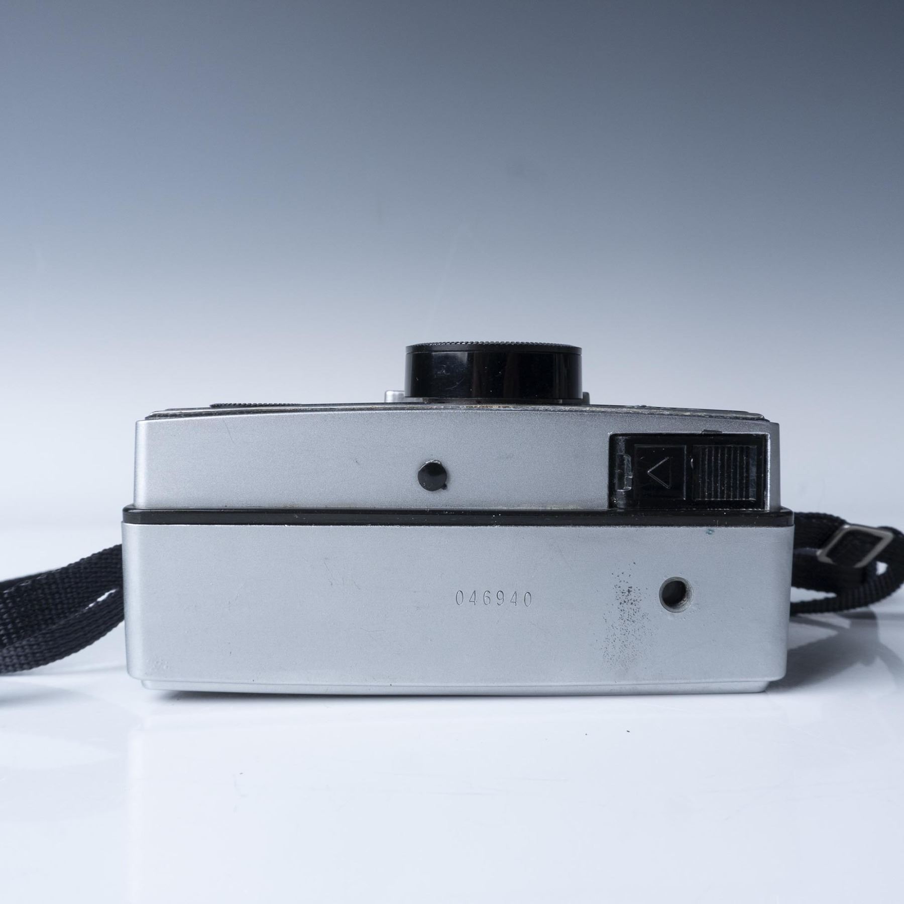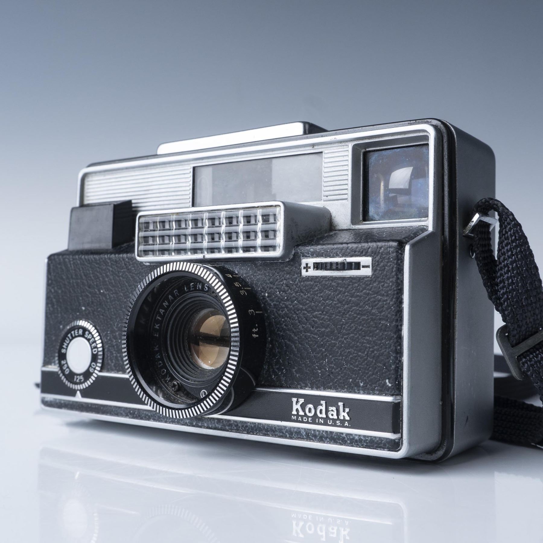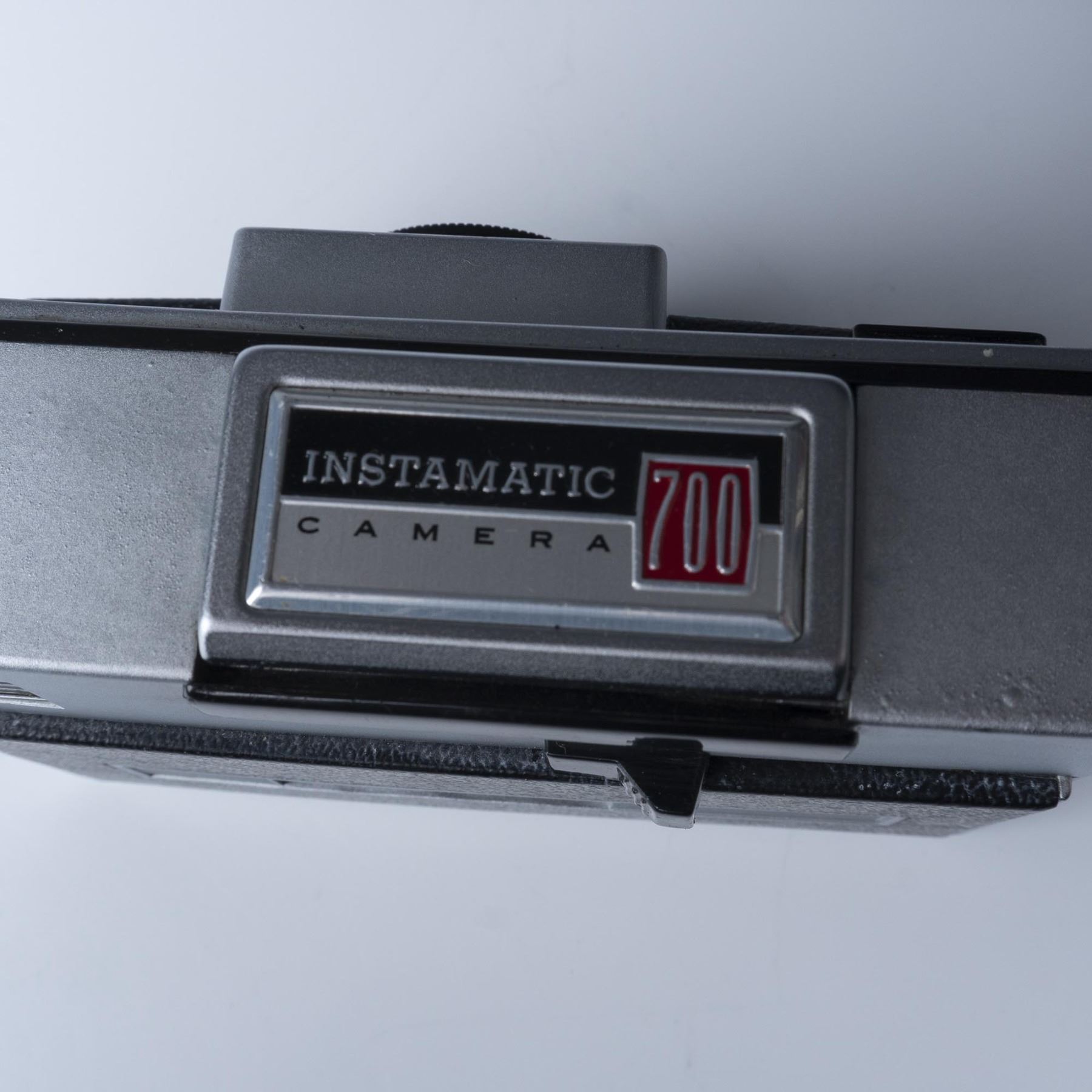 700 film camera, produced in the United States during the 1960s. Features a Kodak Ektanar 38mm f/2.8 lens, offering fixed focal length for versatile everyday use. This model includes manual shutter speed controls, with options for 1/30 and 1/125 seconds, ideal for film photography enthusiasts. The camera measures approximately 3.25”H and retains its original black leatherette finish with chrome accents, showcasing classic mid-century design. Serial number 046940 is stamped on the base for identification. The Kodak Instamatic series revolutionized photography with its cartridge-based film loading system.