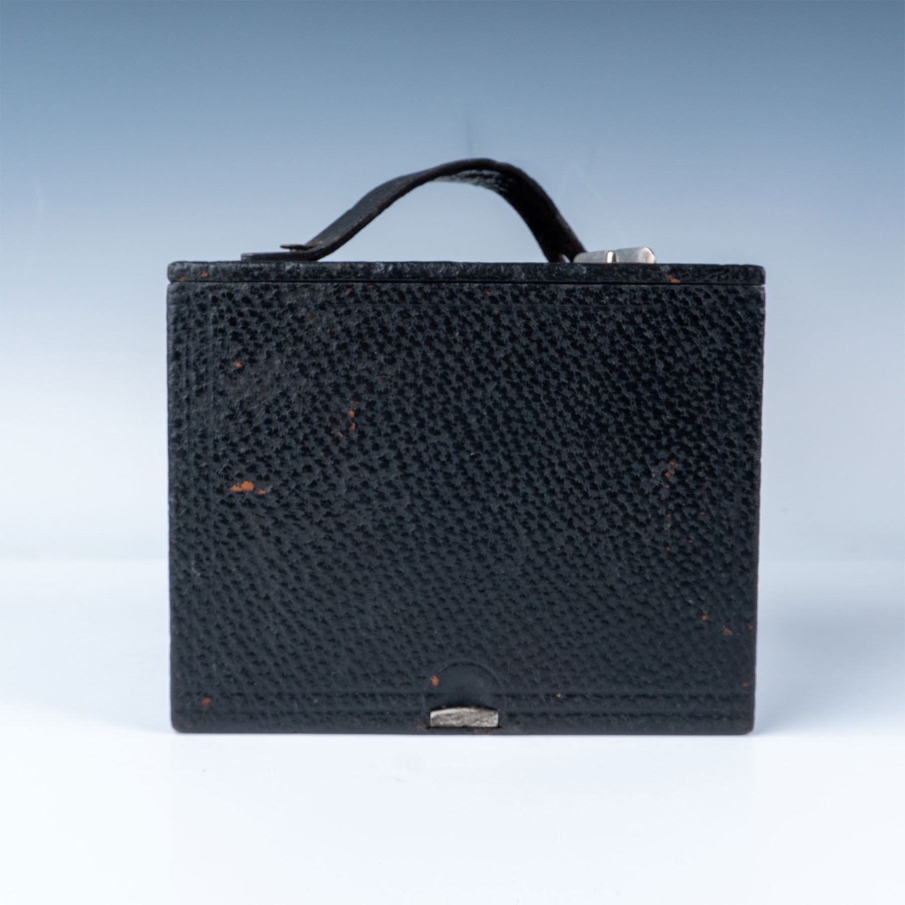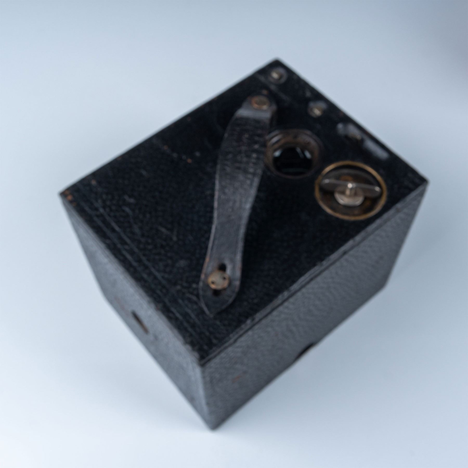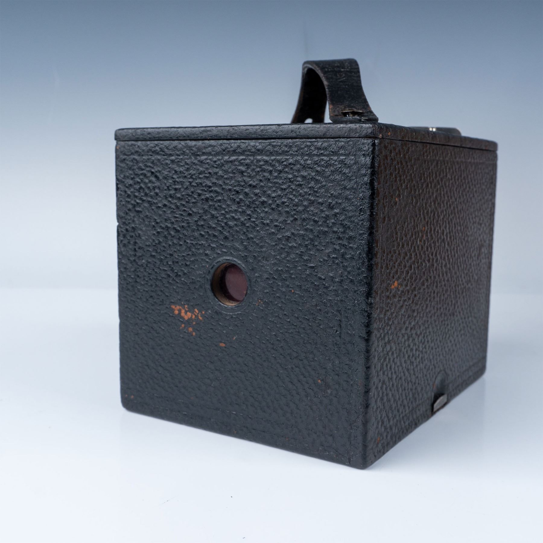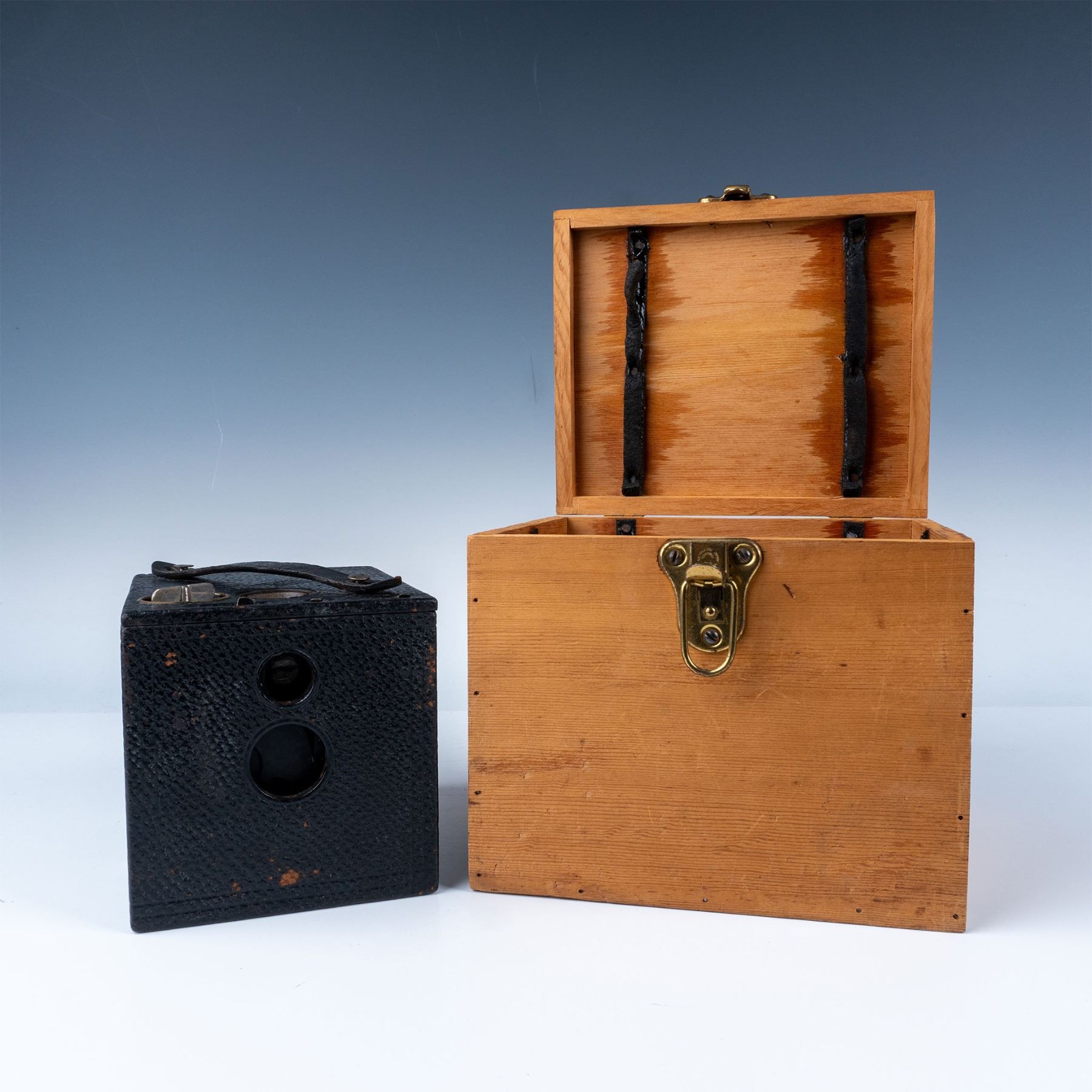 Iconic Kodak No. 2 Bulls Eye Model D camera, a revolutionary piece of photographic history first introduced in the early 20th century. This model features a black leatherette body with metal hardware and a manual film advance mechanism. The Kodak Brownie cameras were pivotal in making photography accessible to the masses, renowned for their simplicity and affordability. This piece is an excellent example of early 20th-century craftsmanship and design. The item includes a wooden carrying box.