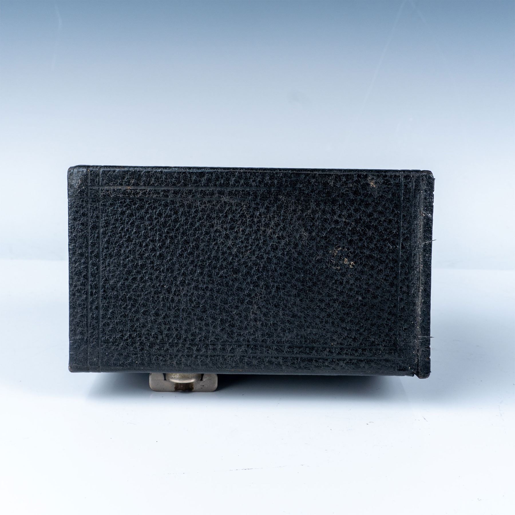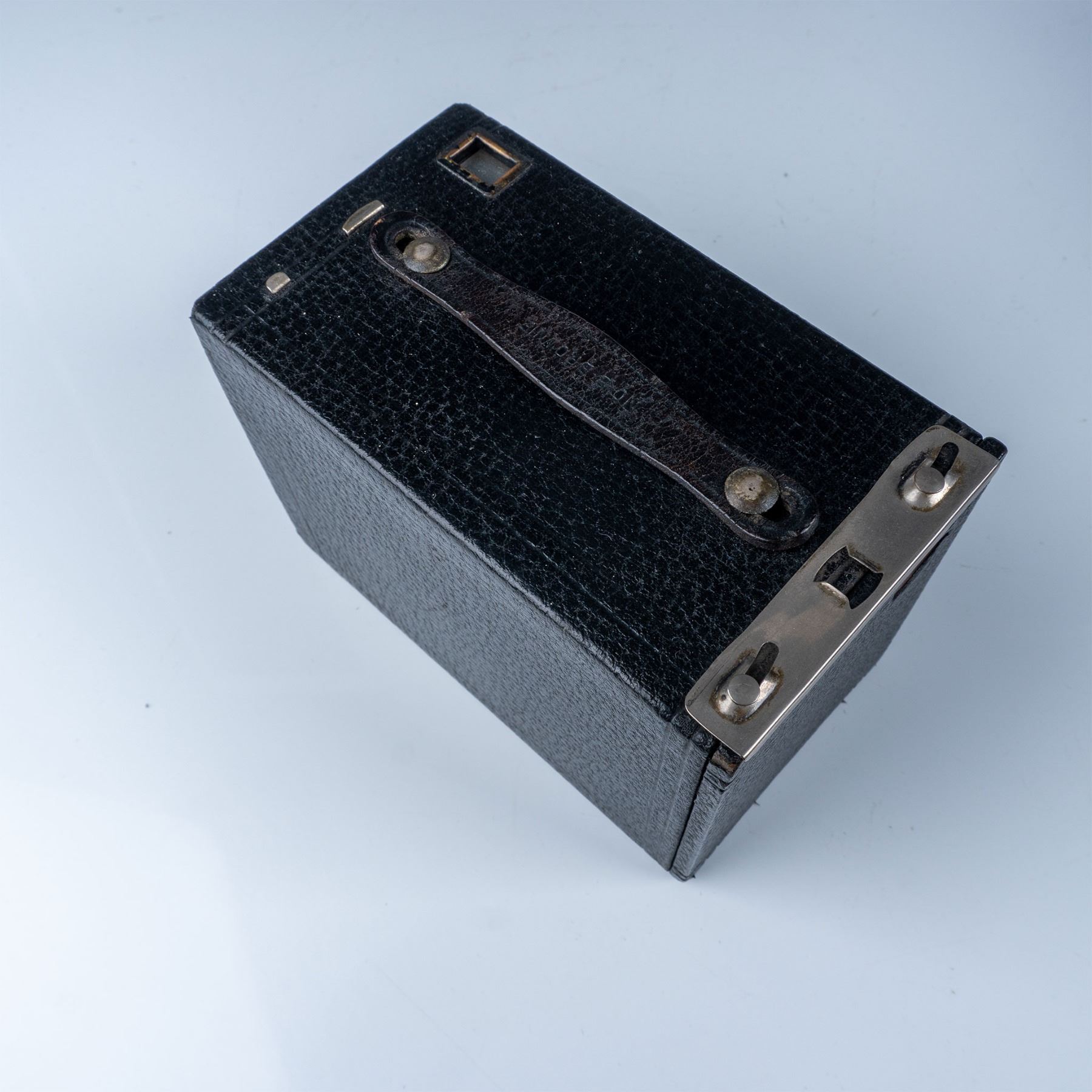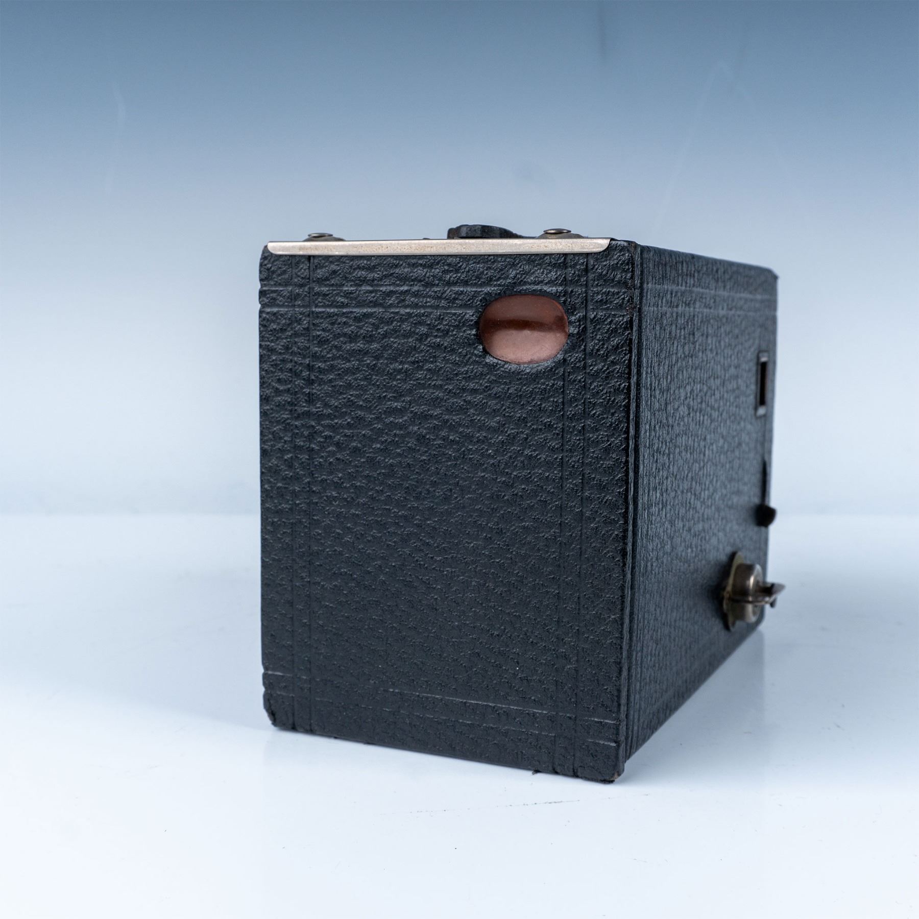 Known for its simplicity and durability, the Brownie series was instrumental in making photography accessible to the masses. Metal with a leatherette covering. Designed for 120 roll film.