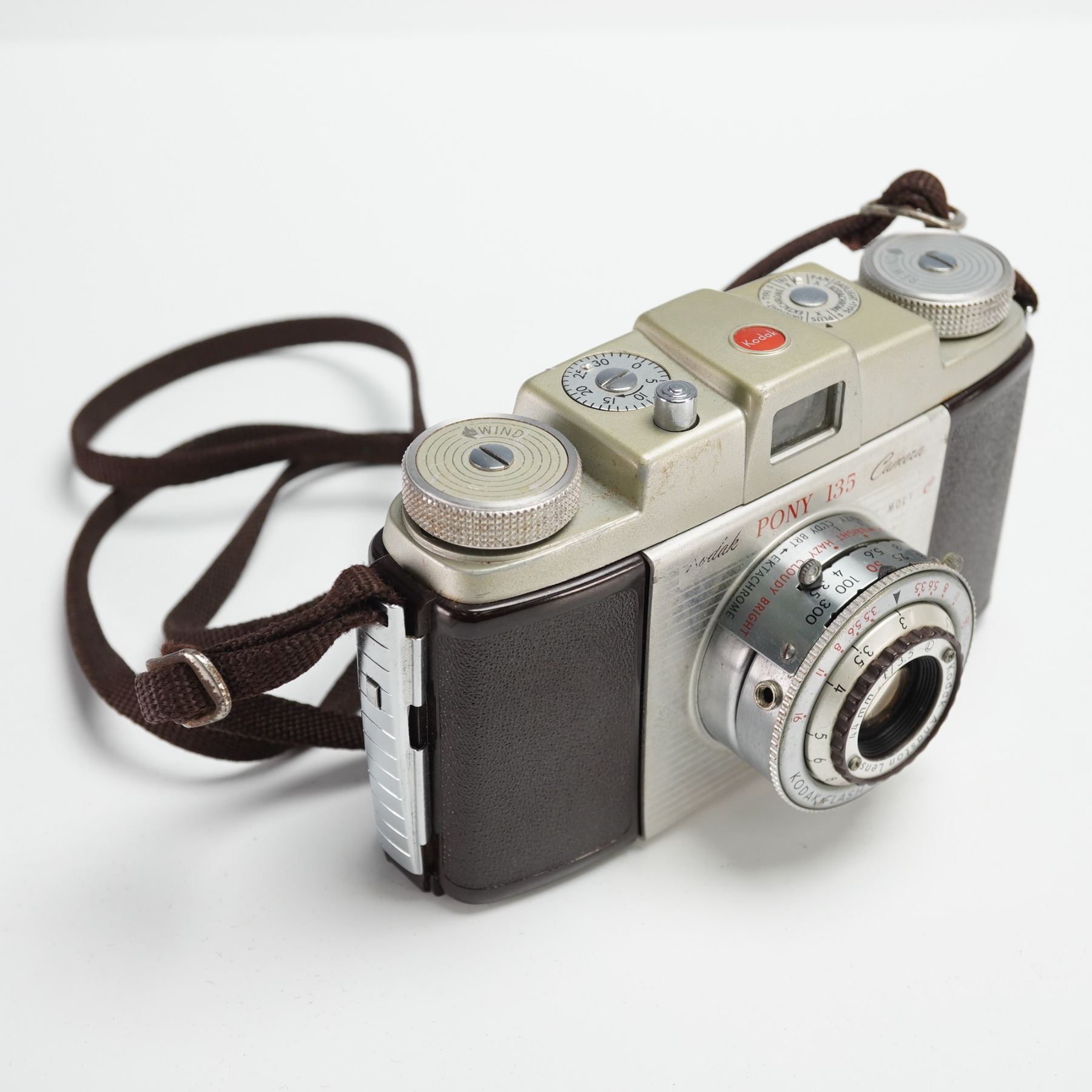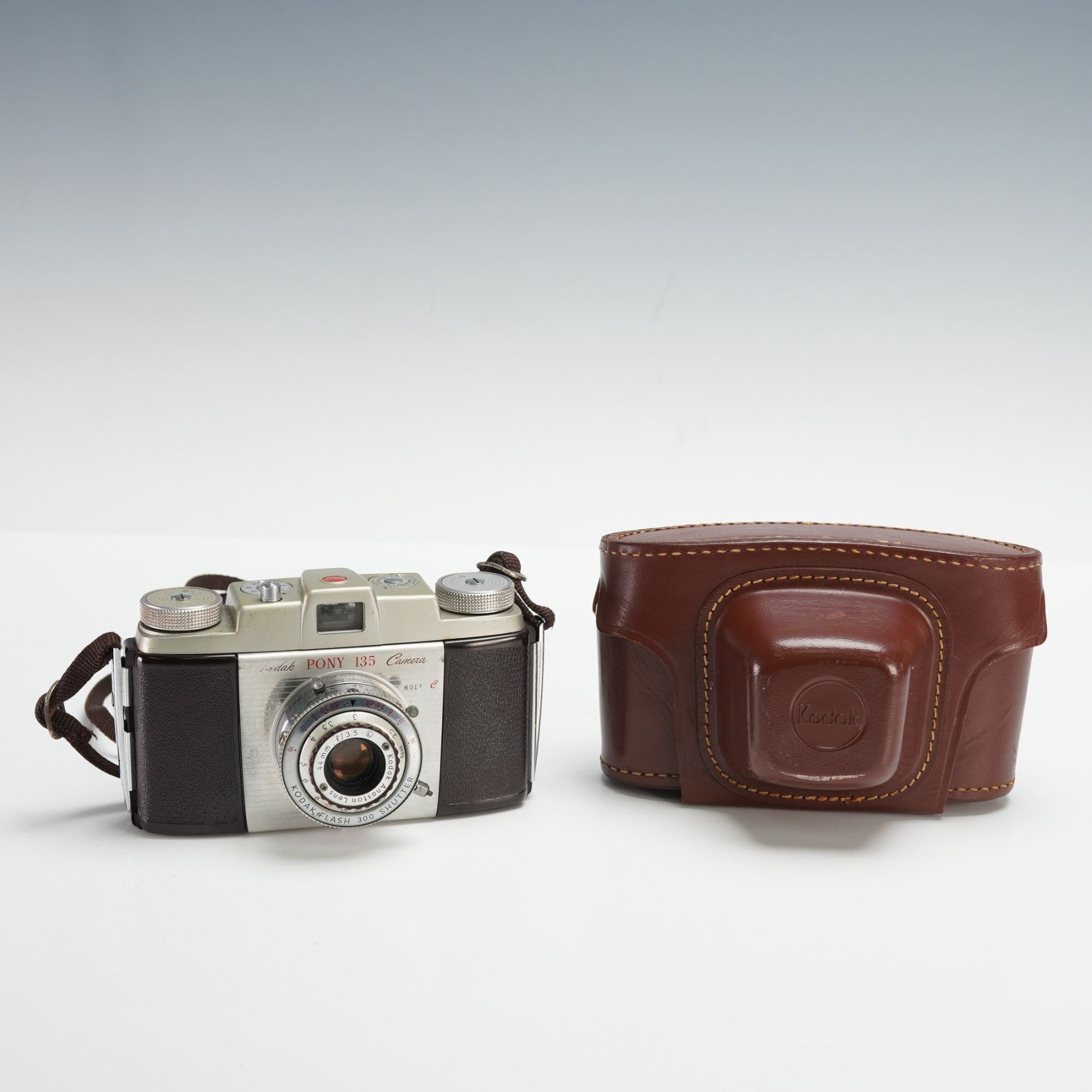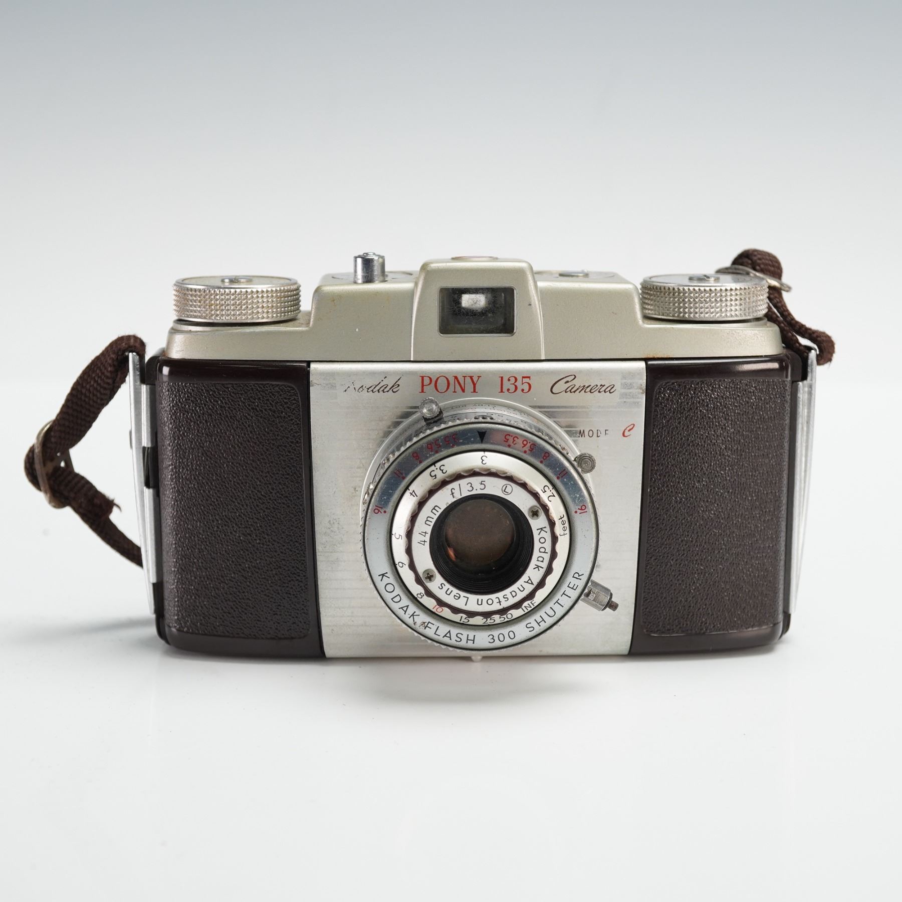 Kodak Pony 135 Model C 35mm viewfinder camera, featuring a Kodak Anaston 44mm f/3.5 lens and Kodalux flash 300 shutter. Finished in silver and brown with matching leather carrying case. Produced in the mid-1950s, this compact camera represents Kodak's transition into more accessible 35mm photography for the everyday user. A charming piece of photographic history with timeless midcentury style.