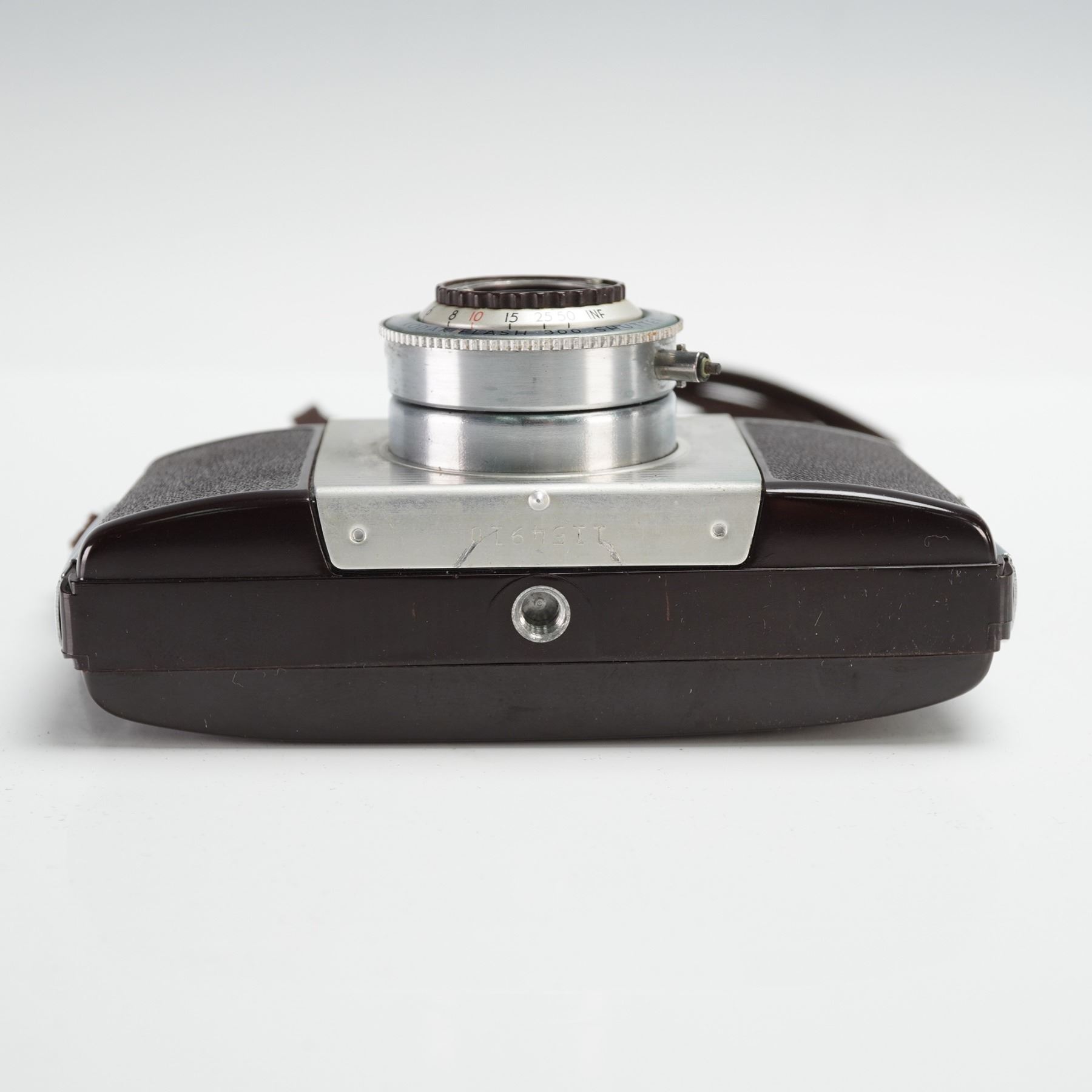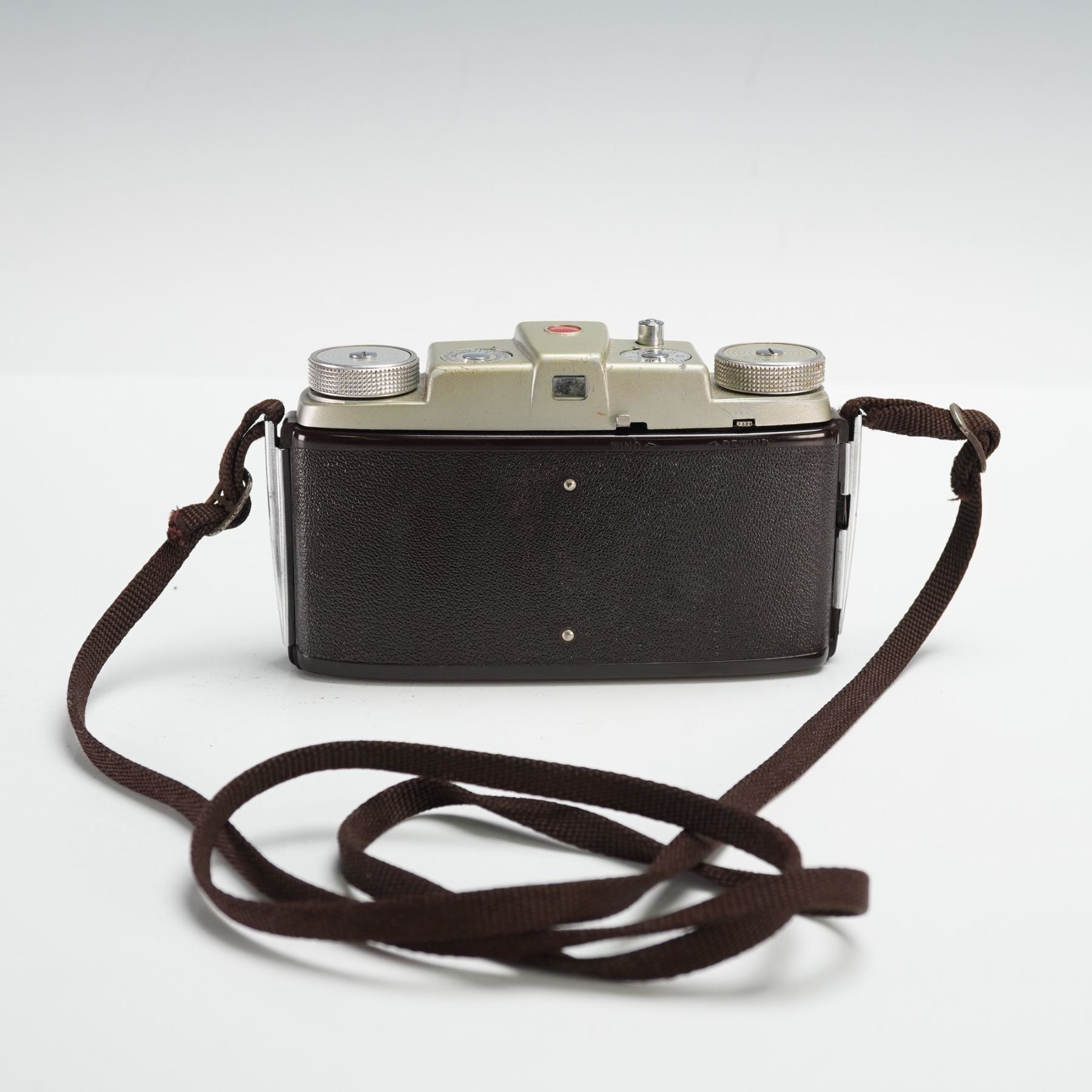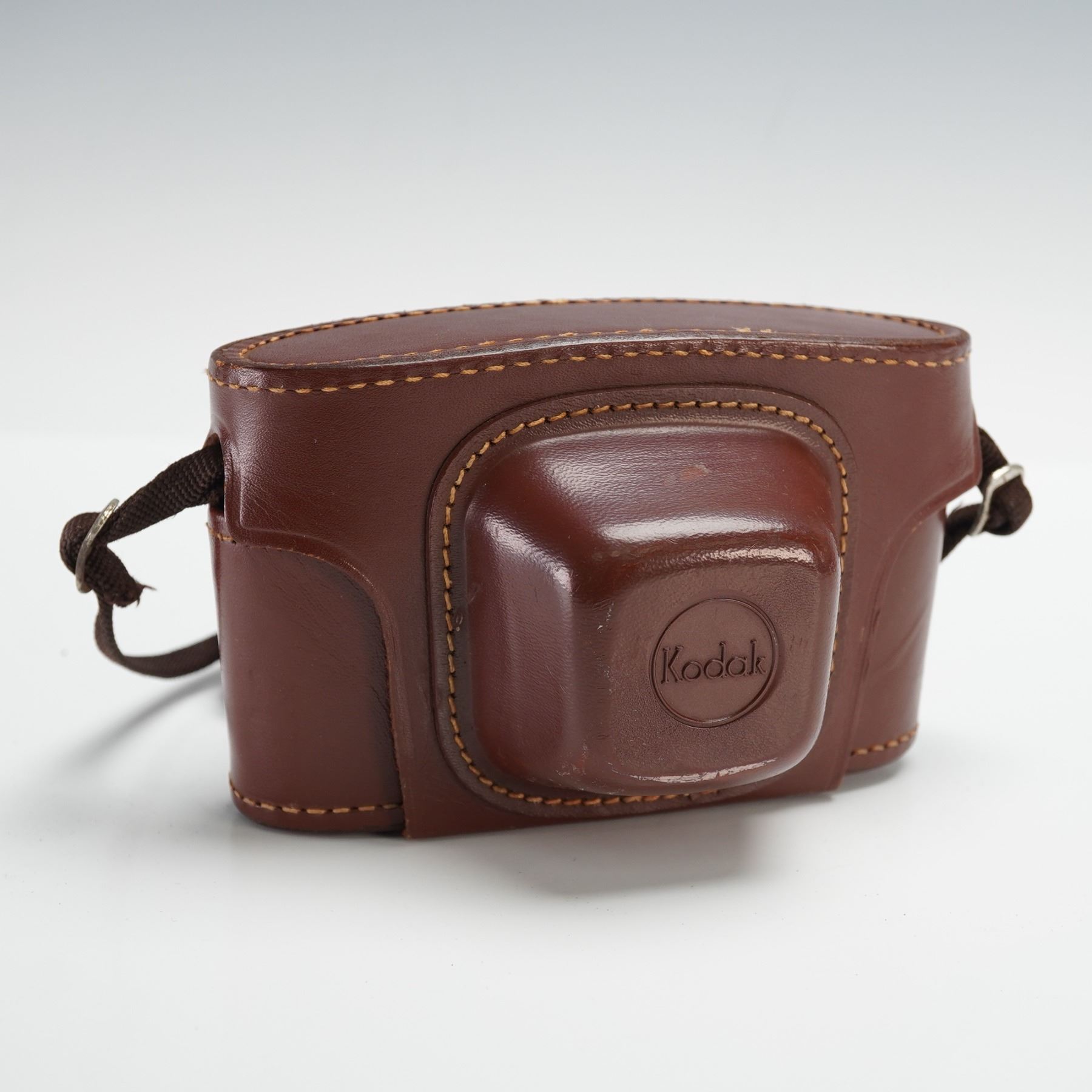 Kodak Pony 135 Model C 35mm viewfinder camera, featuring a Kodak Anaston 44mm f/3.5 lens and Kodalux flash 300 shutter. Finished in silver and brown with matching leather carrying case. Produced in the mid-1950s, this compact camera represents Kodak's transition into more accessible 35mm photography for the everyday user. A charming piece of photographic history with timeless midcentury style.