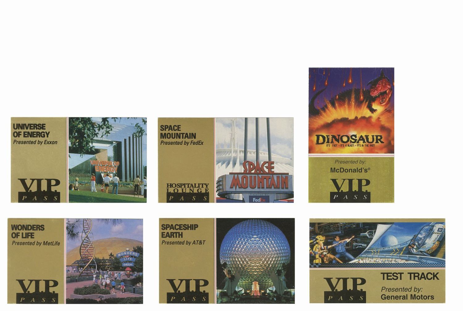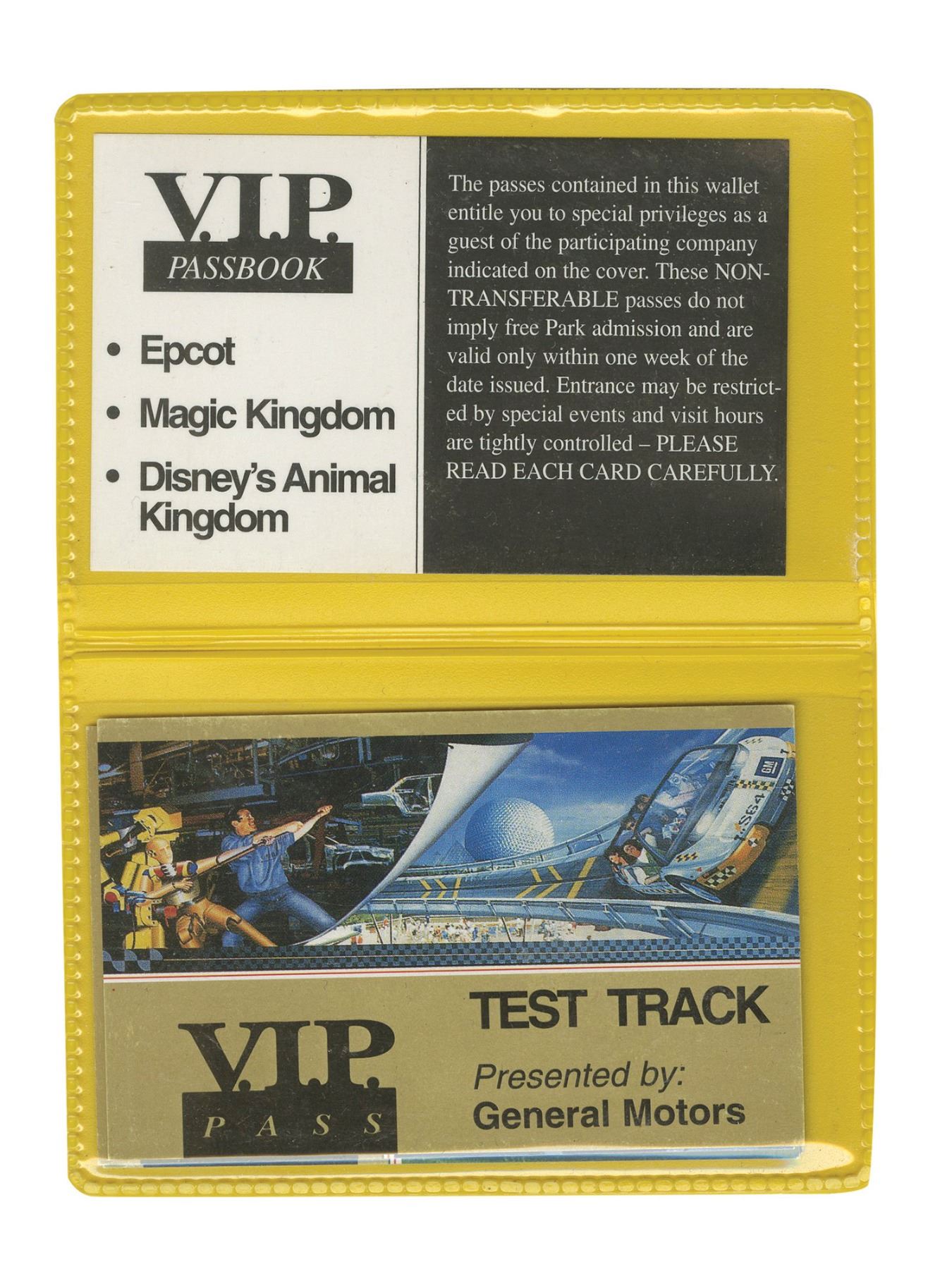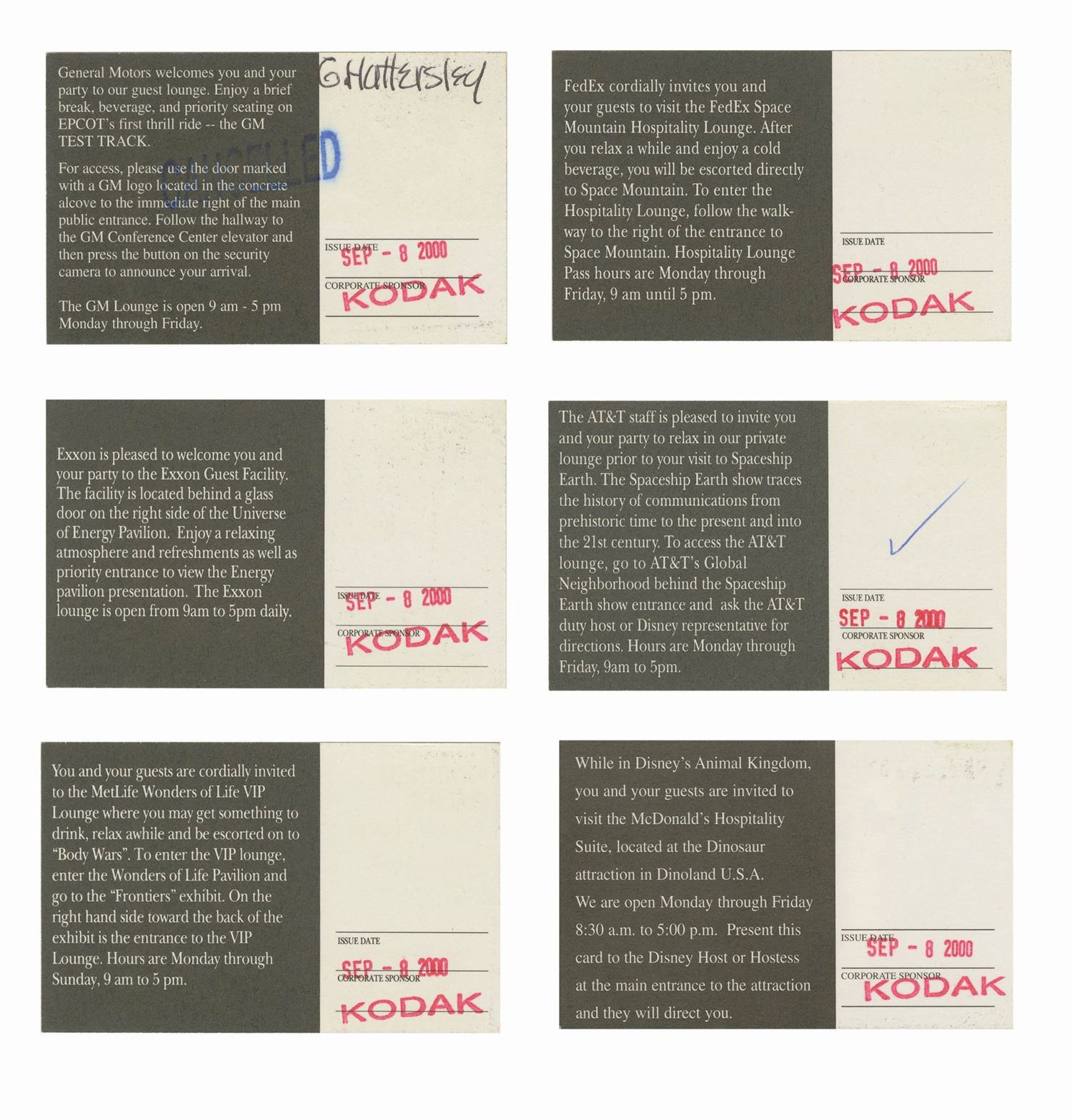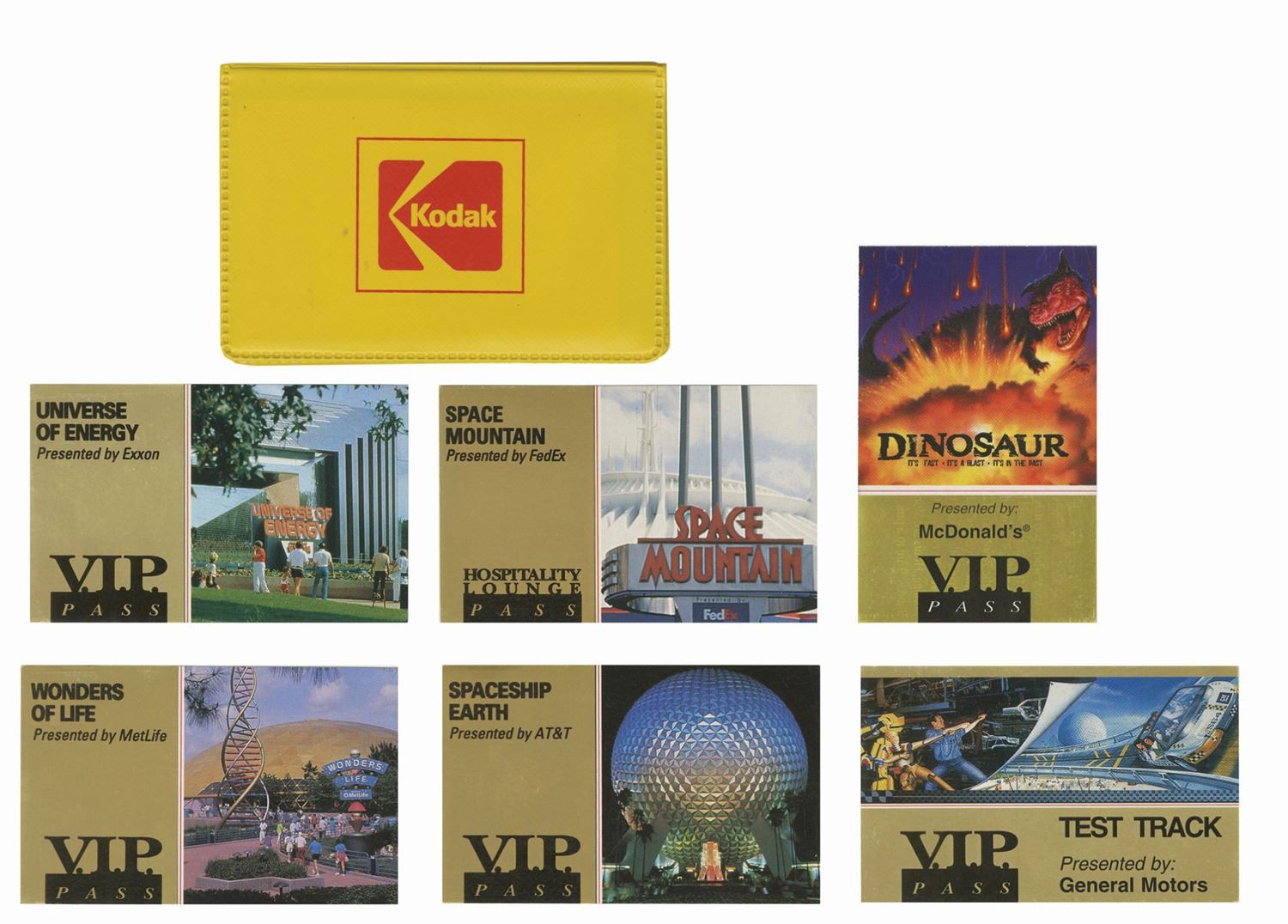 (Walt Disney World, 2000) A collection of (6) VIP lounge tickets from a Kodak event. These lounge tickets allow the guest access to specific VIP lounges attached to attractions, and to be escorted directly onto the rides. Included are tickets for: Test Track, Space Mountain, Universe of Energy, Spaceship Earth, Wonders of Life, and Dinosaur. Each lounge is sponsored by a different company, and all of the tickets are stored in a folding holder with the Kodak logo. Measuring 2.75"x4" overall, the folder and tickets are in very good condition with minimal wear.