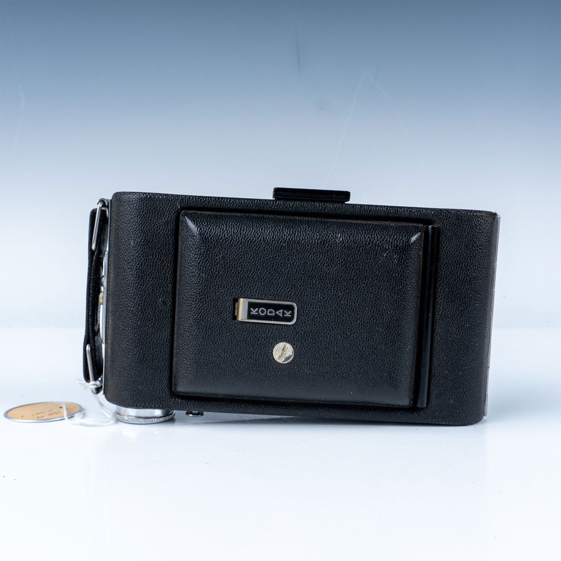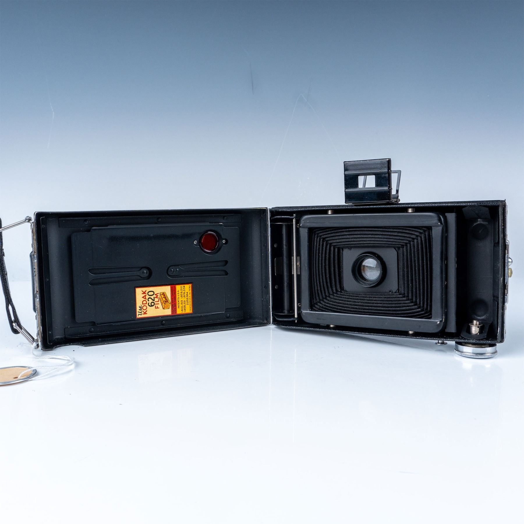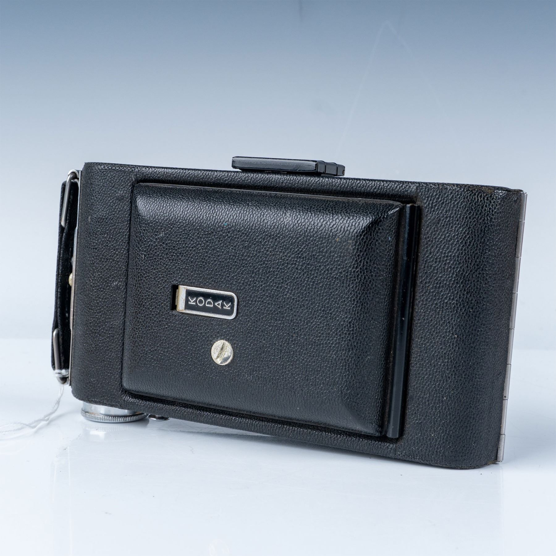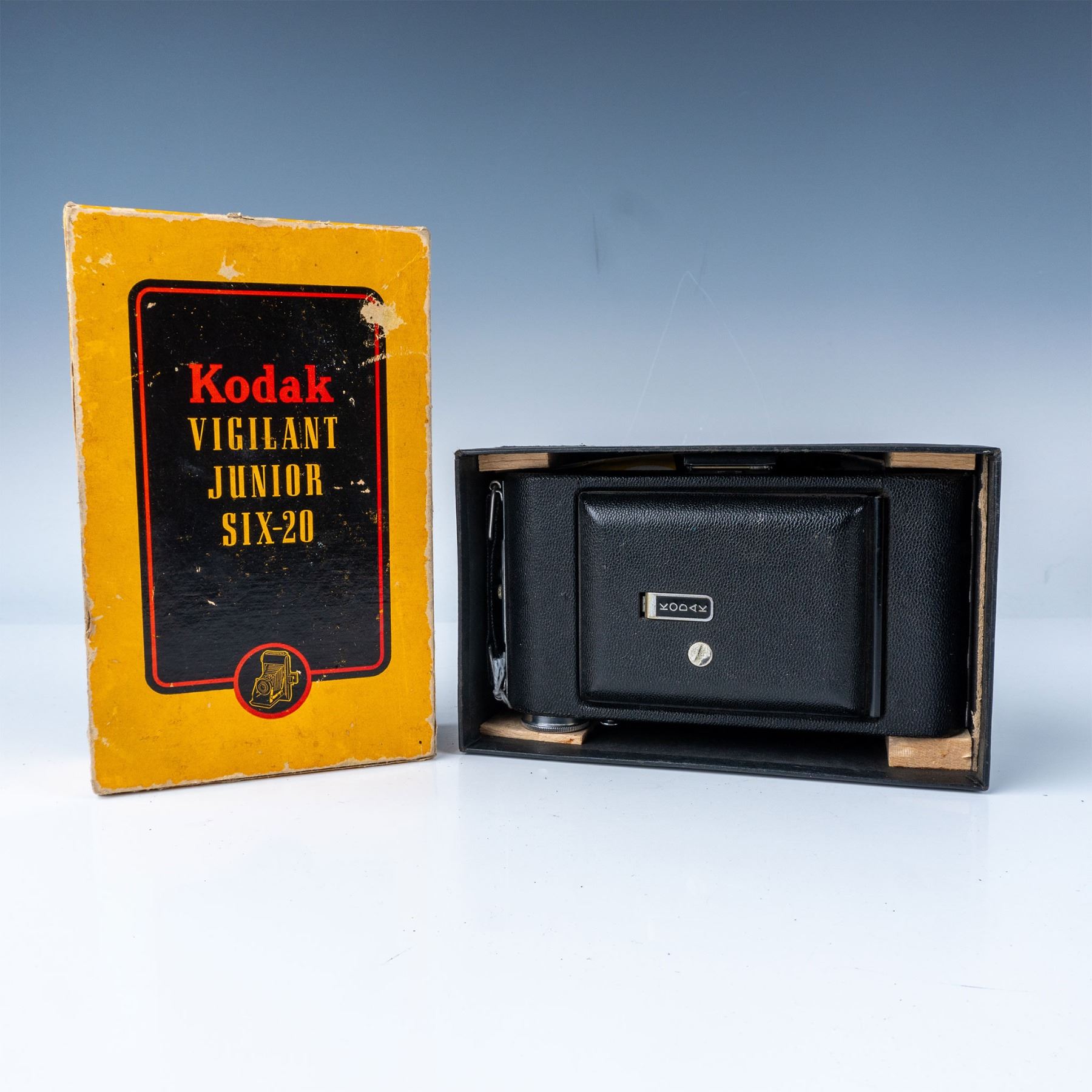 A classic folding camera from the mid-20th century. This model features a durable metal body with a leatherette covering, a fold-out bellows design, and a Kodak lens. It comes with its original box, adding to its collectible appeal. The Kodak Vigilant Junior Six-20 was designed to use 620 film, a favorite among amateur photographers of the time. This item has its original box.