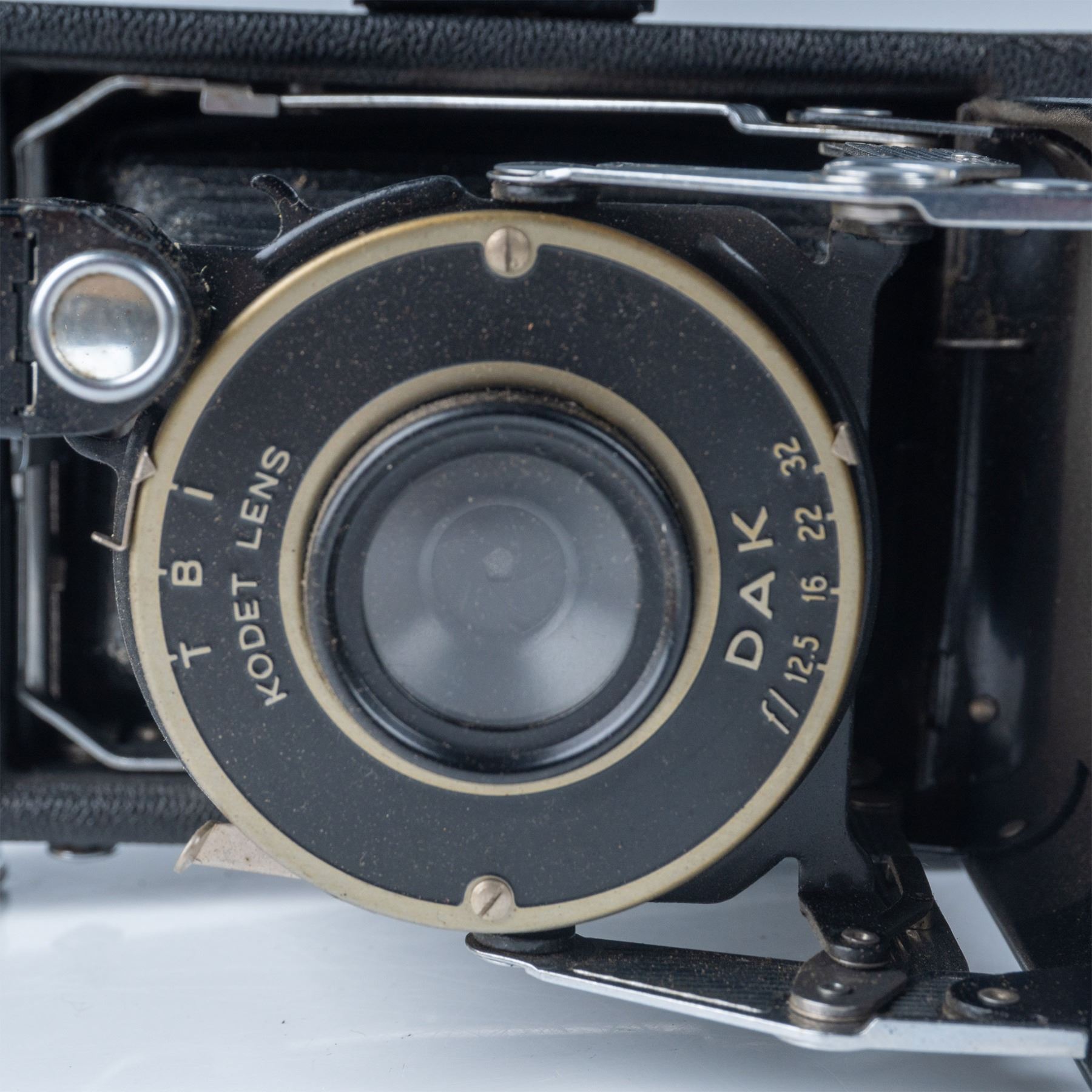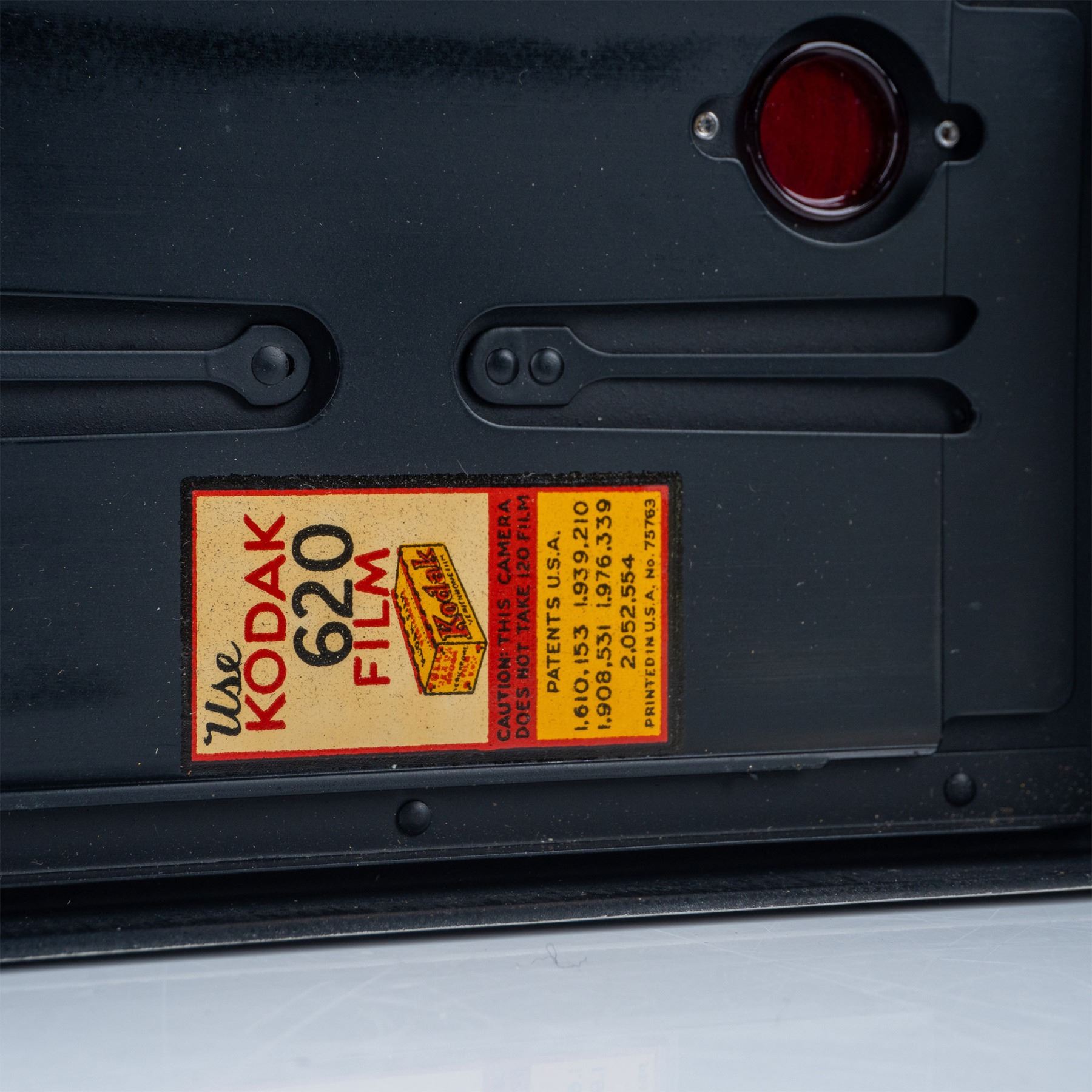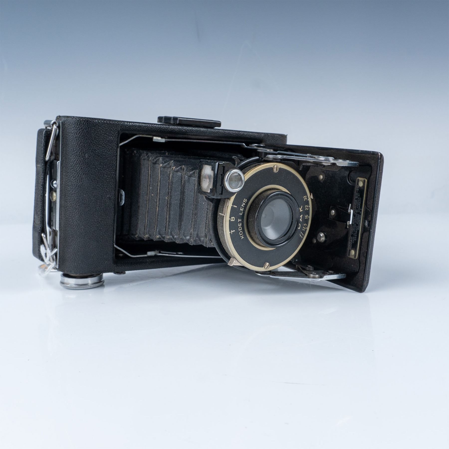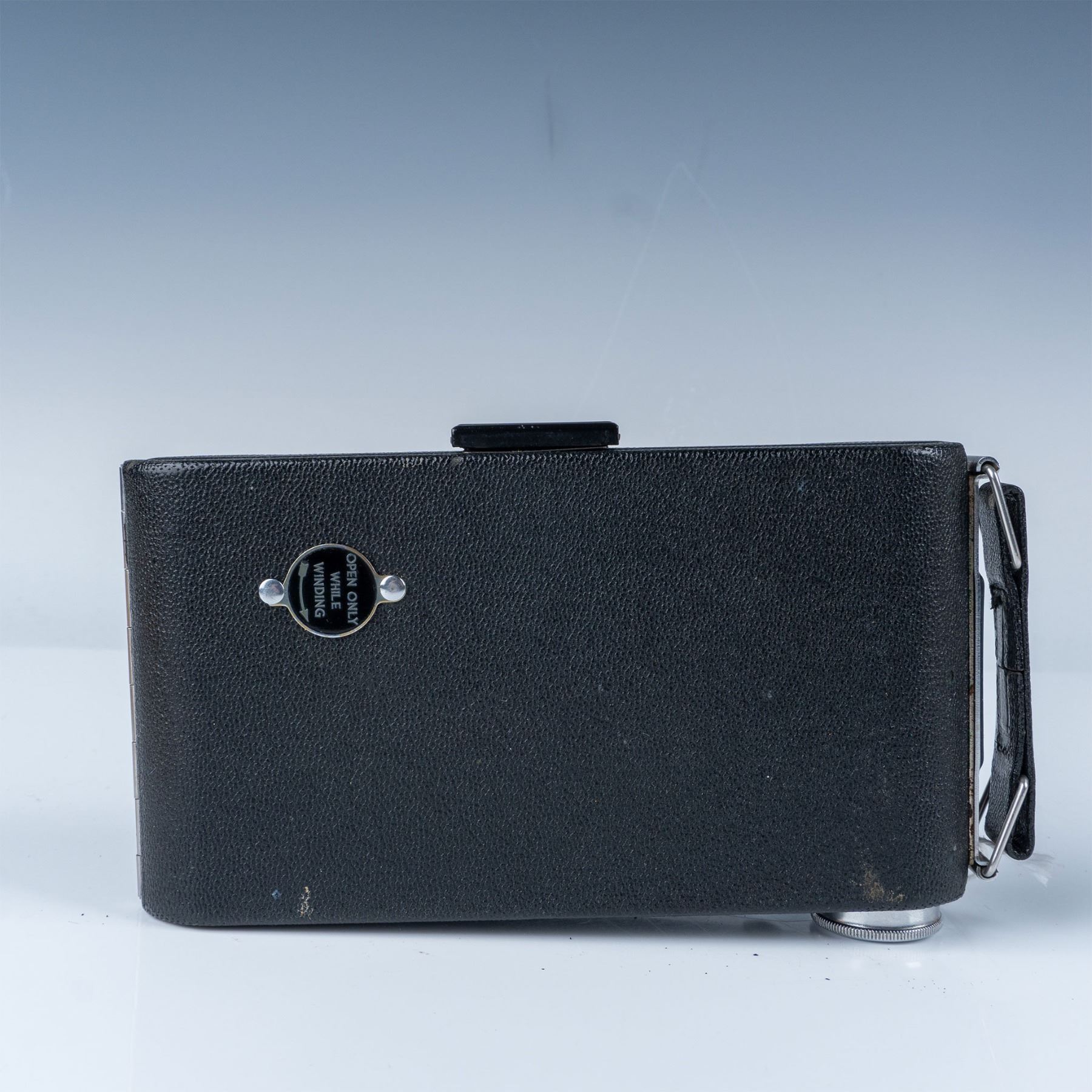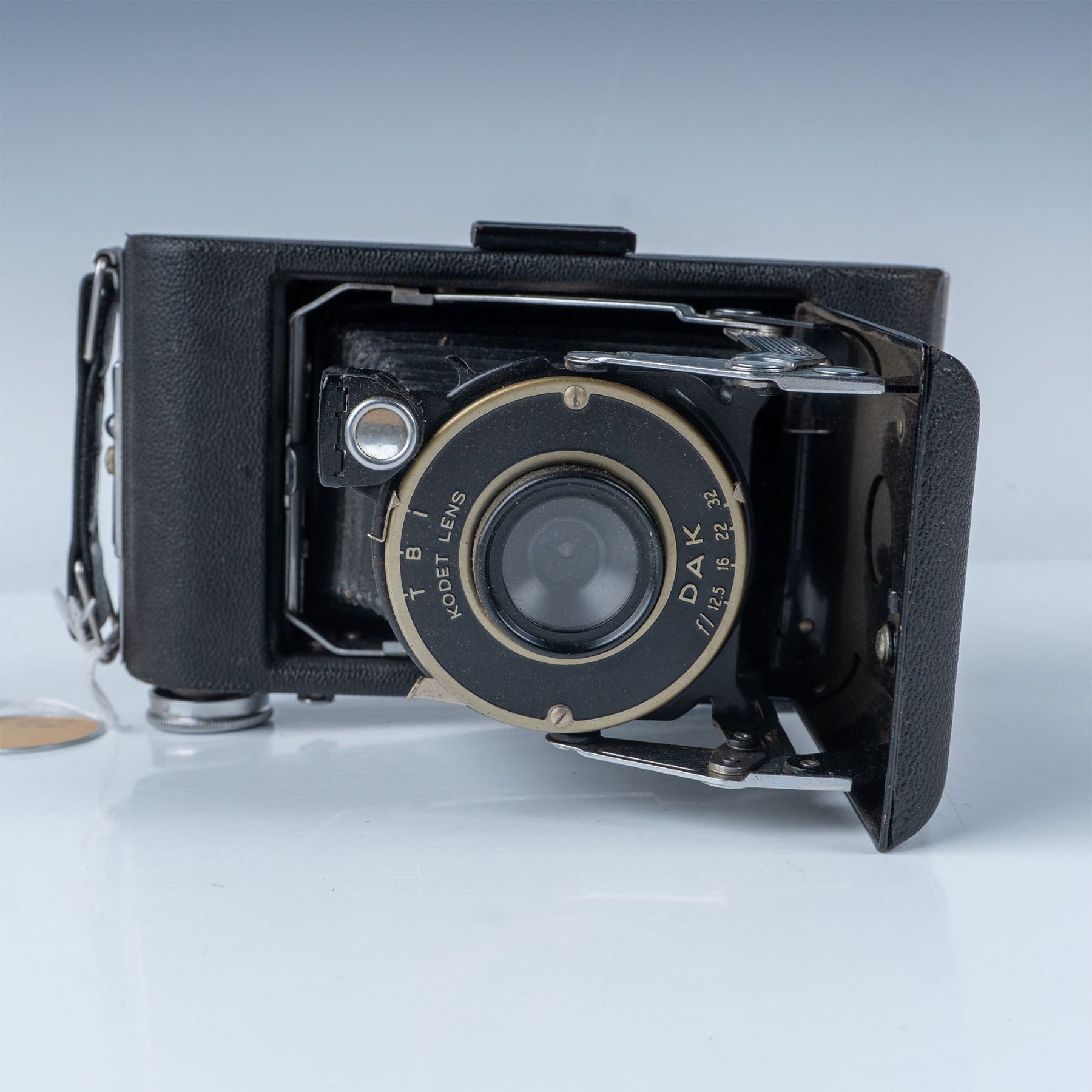 A classic folding camera from the mid-20th century. This model features a durable metal body with a leatherette covering, a fold-out bellows design, and a Kodak lens. It comes with its original box, adding to its collectible appeal. The Kodak Vigilant Junior Six-20 was designed to use 620 film, a favorite among amateur photographers of the time. This item has its original box.