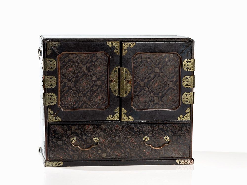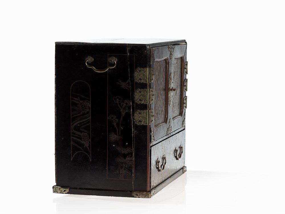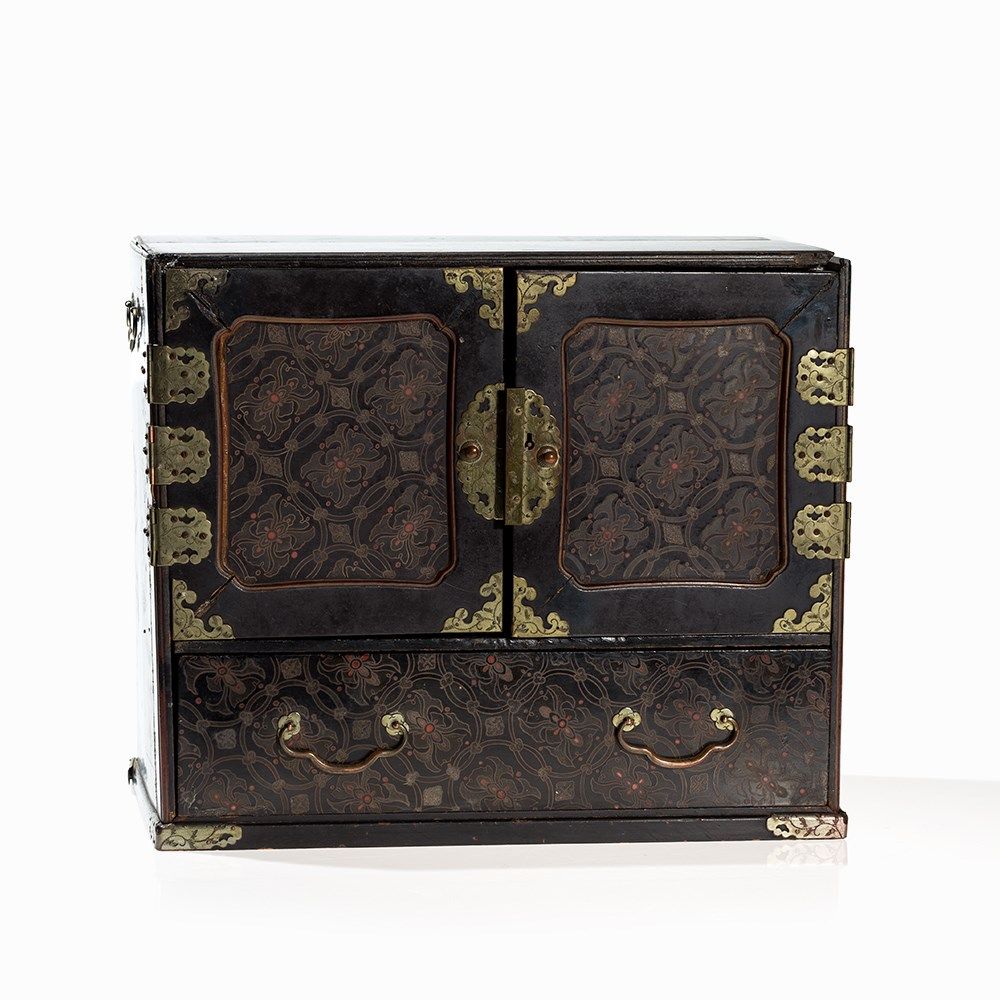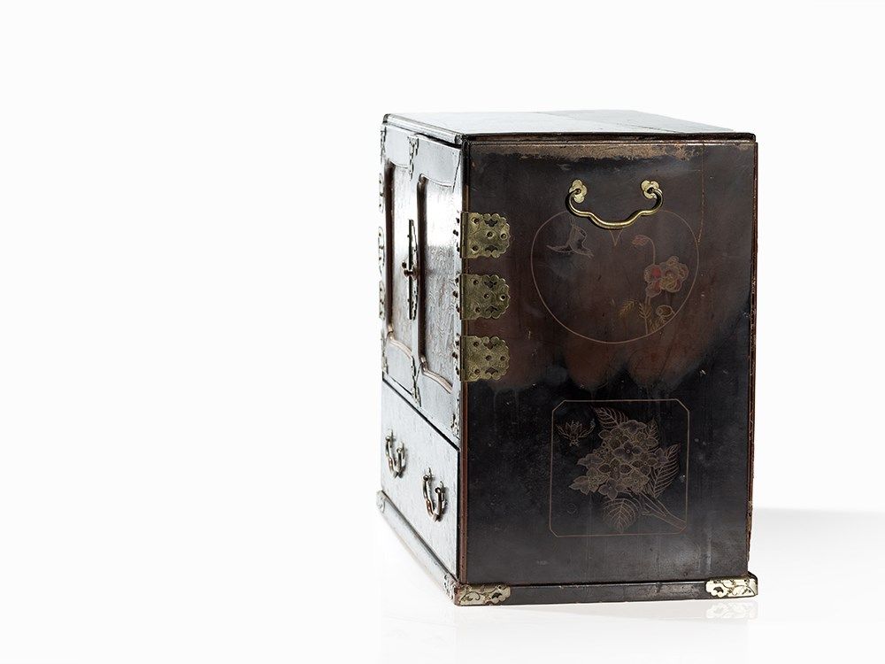 This so-called kodansu cabinet was built during the Meiji period. It was originally used to store personal items. The lacquered wooden carcass is decorated with polychrome painting in gold and red on a black ground. The painting depicts floral motifs and ornamental patterns. The sides and the top are adorned with cartouches of flowers, birds and turtles – a symbol of longevity. Elegant, partly openwork fittings adorn the front. The double doors open to reveal six drawers. The interior is also decorated with fine lacquer painting of floral motifs.
