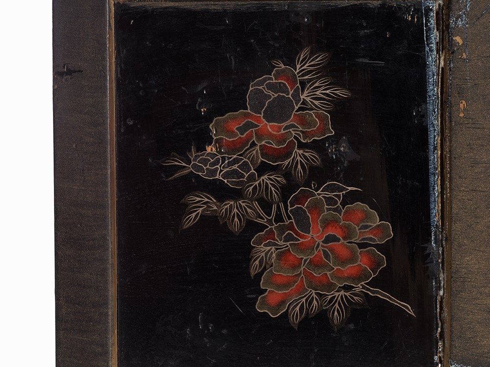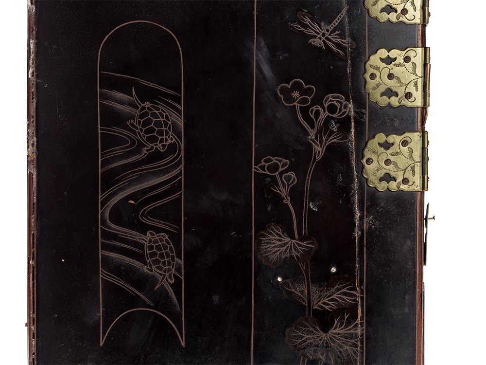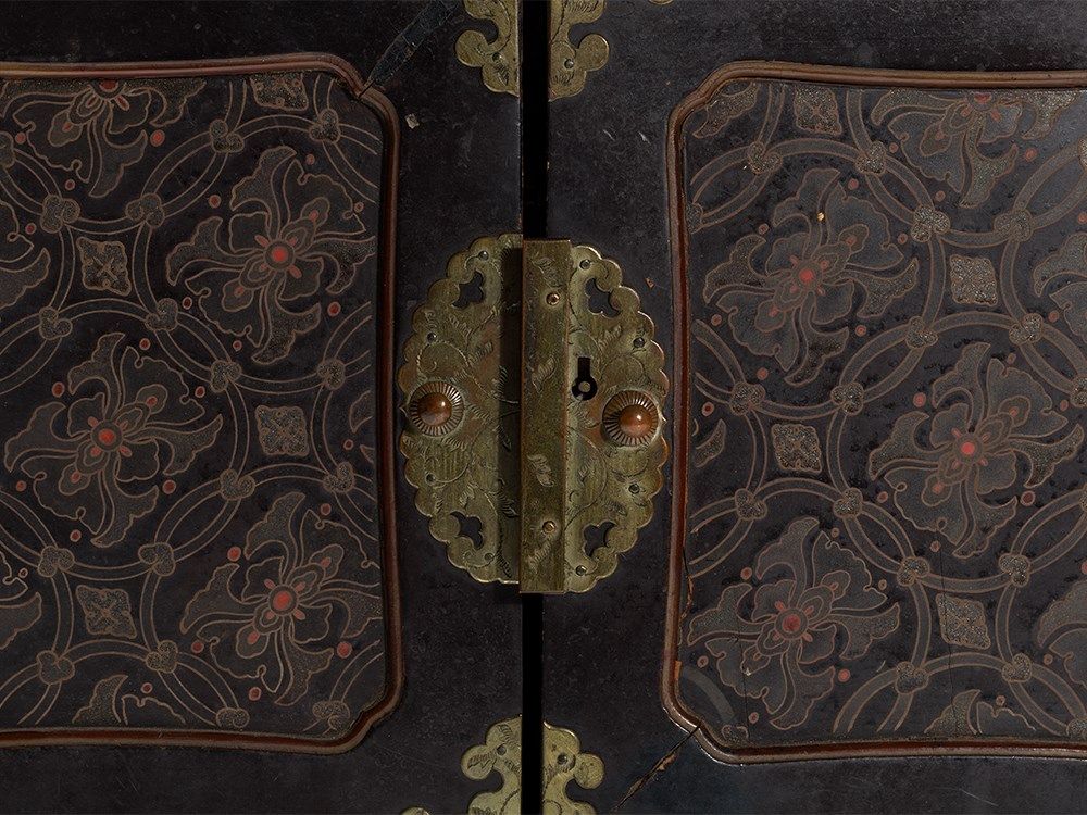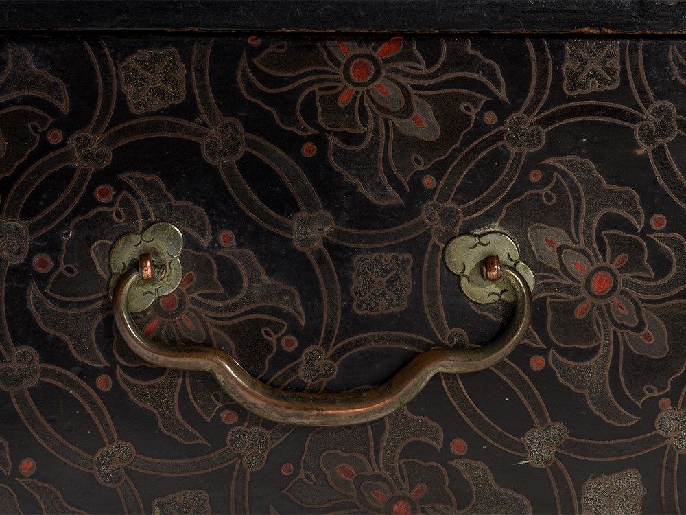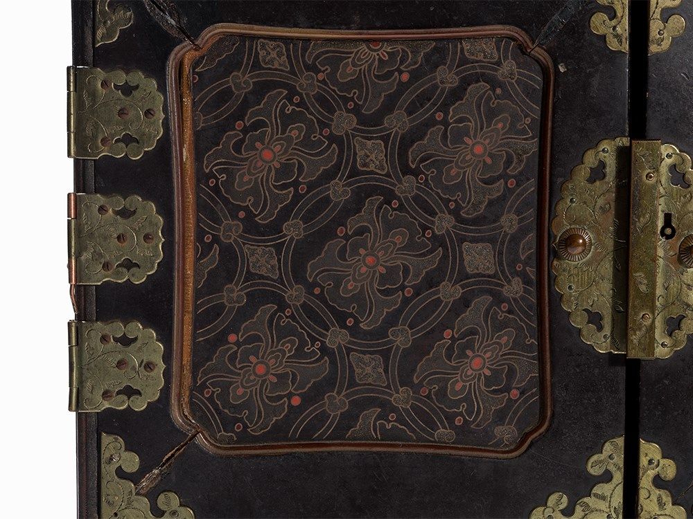 This so-called kodansu cabinet was built during the Meiji period. It was originally used to store personal items. The lacquered wooden carcass is decorated with polychrome painting in gold and red on a black ground. The painting depicts floral motifs and ornamental patterns. The sides and the top are adorned with cartouches of flowers, birds and turtles – a symbol of longevity. Elegant, partly openwork fittings adorn the front. The double doors open to reveal six drawers. The interior is also decorated with fine lacquer painting of floral motifs.