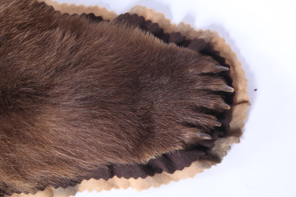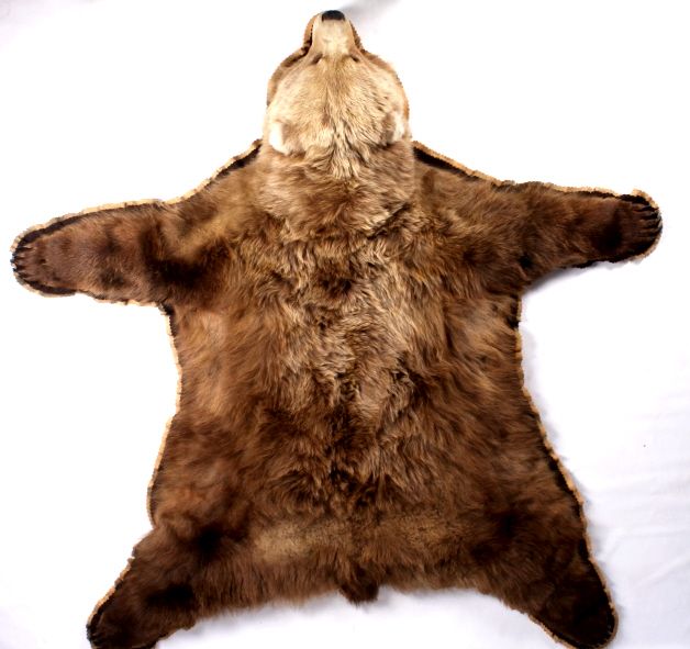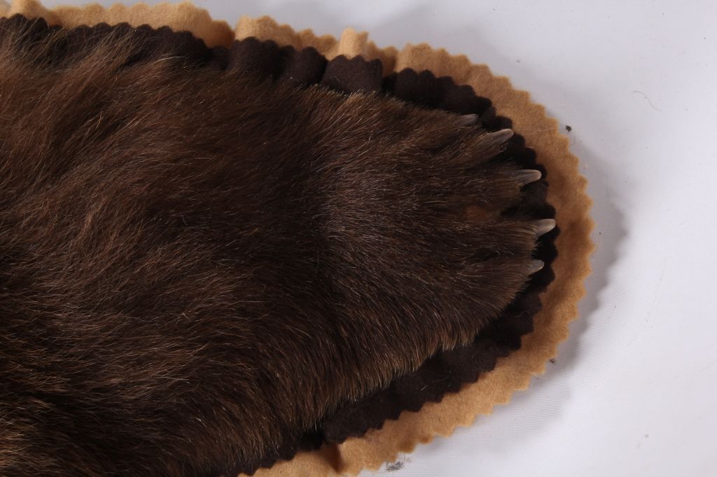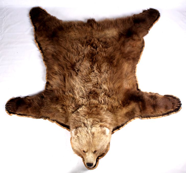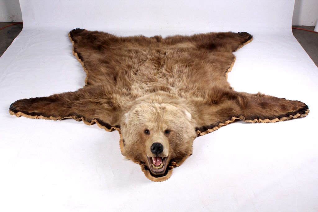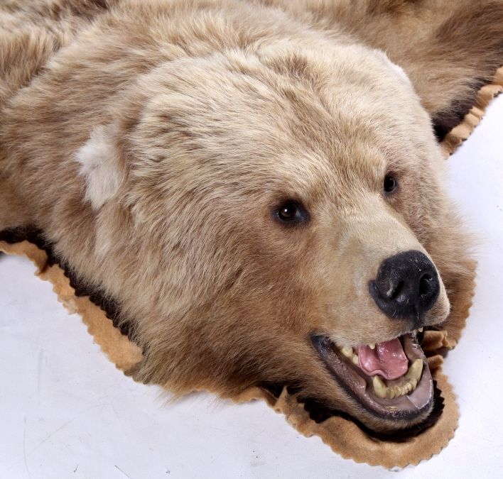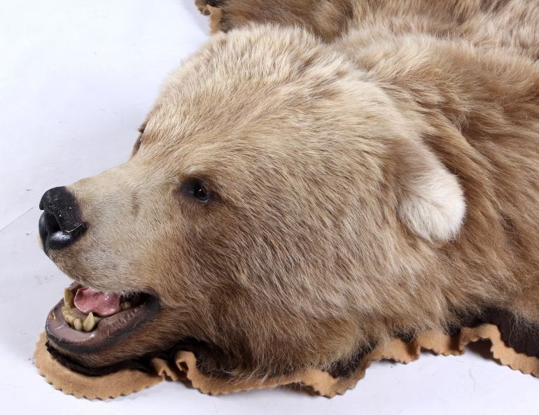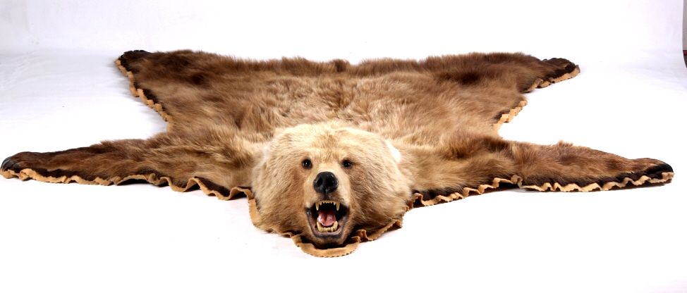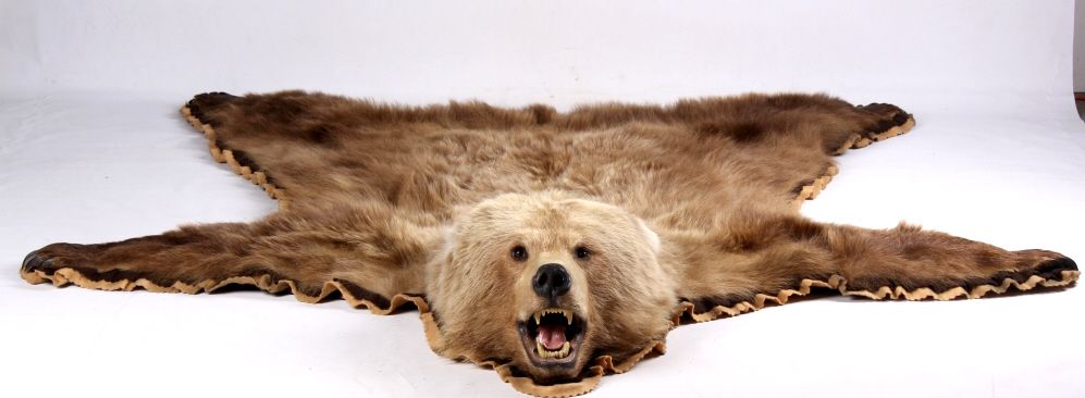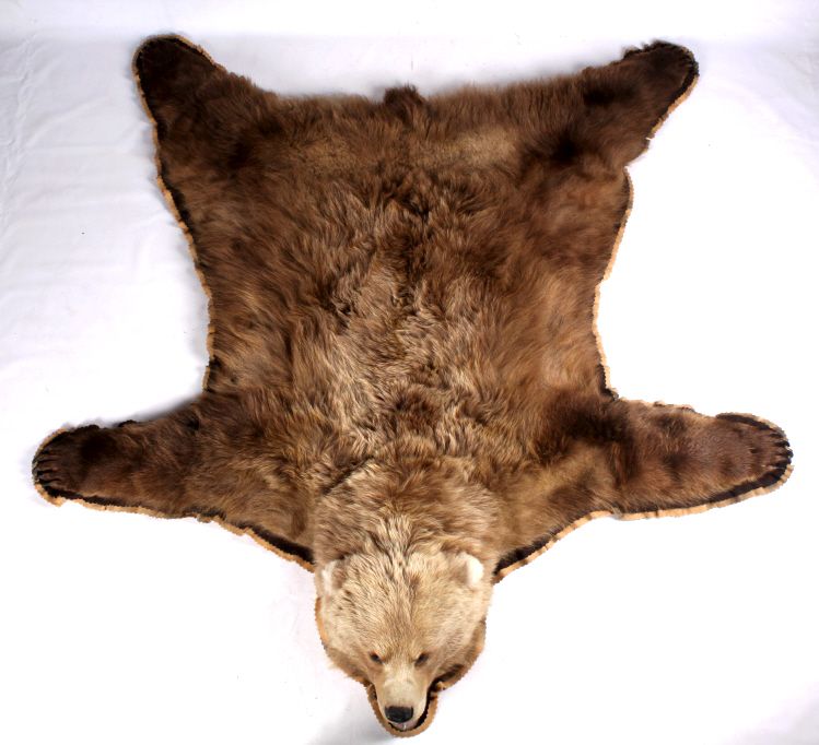 This is an Alaska taken Kodiak Brown Bear or Alaskan Grizzly Bear rug. The rug shows an impressive condition with rare white tipped ears. This has all of the long claws and is a desirable double felted rug. The piece was taken in 1970 by John Gado at North Coldbay. Rare. Rug measures 80.5"x83"
