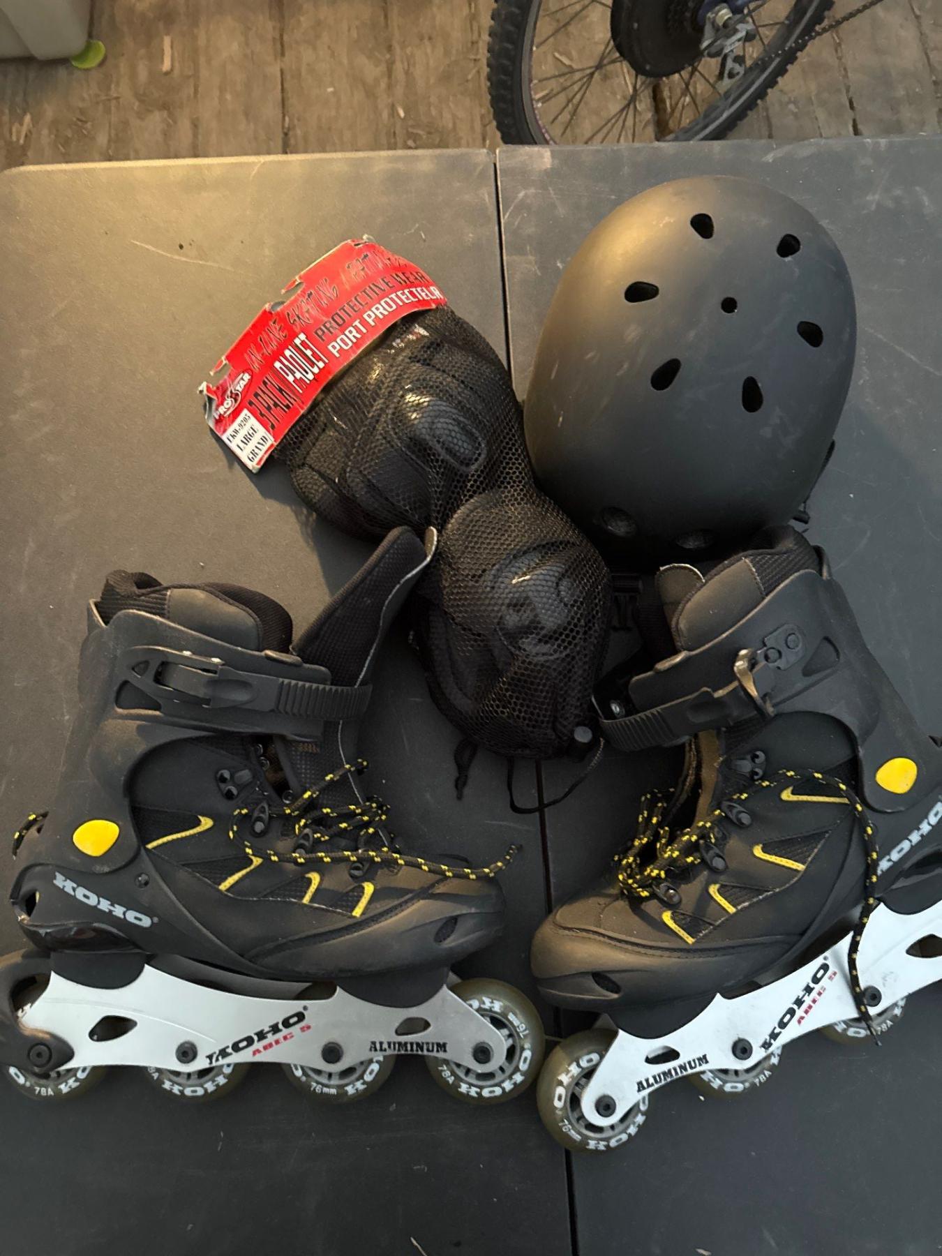 Koho rollerblades. Rollerblading helmet. Size large, extra large. Three pack of protective wear. Size 9 coho roller blades.
