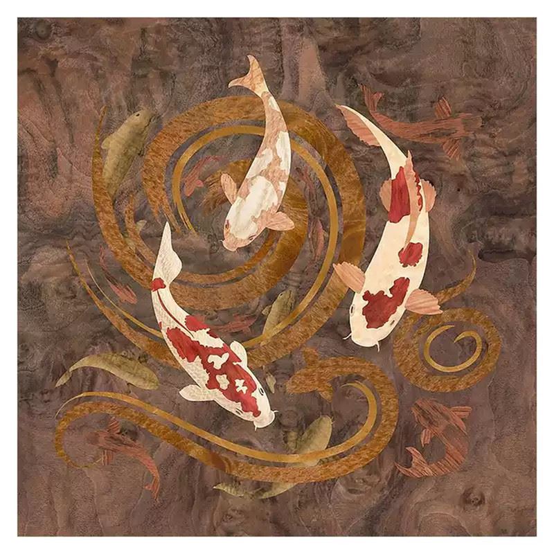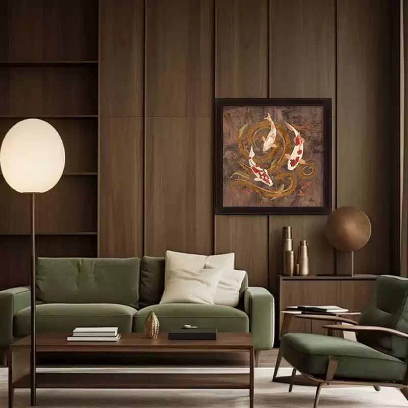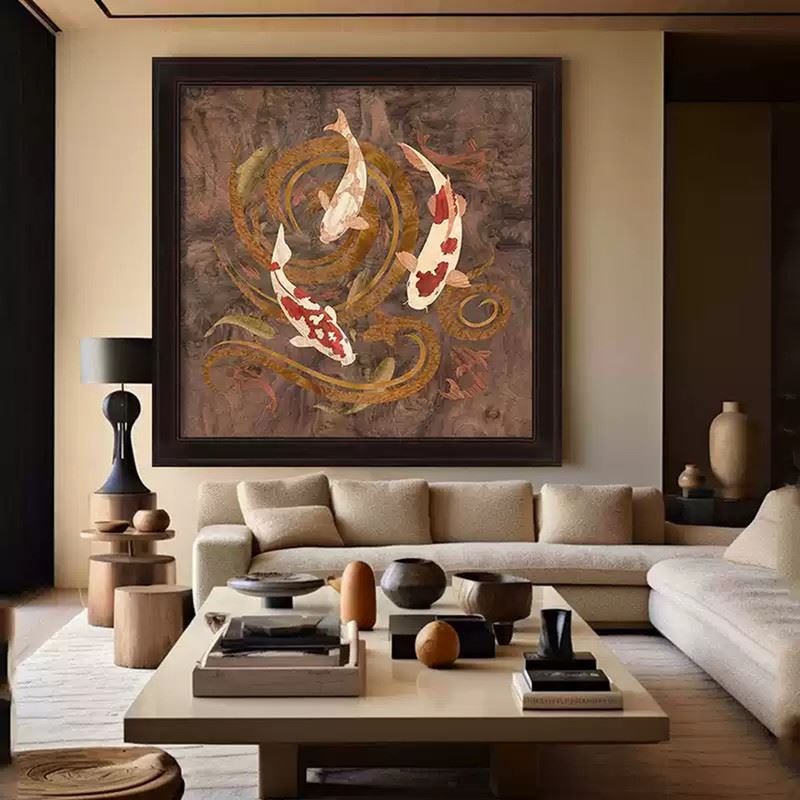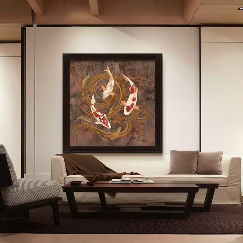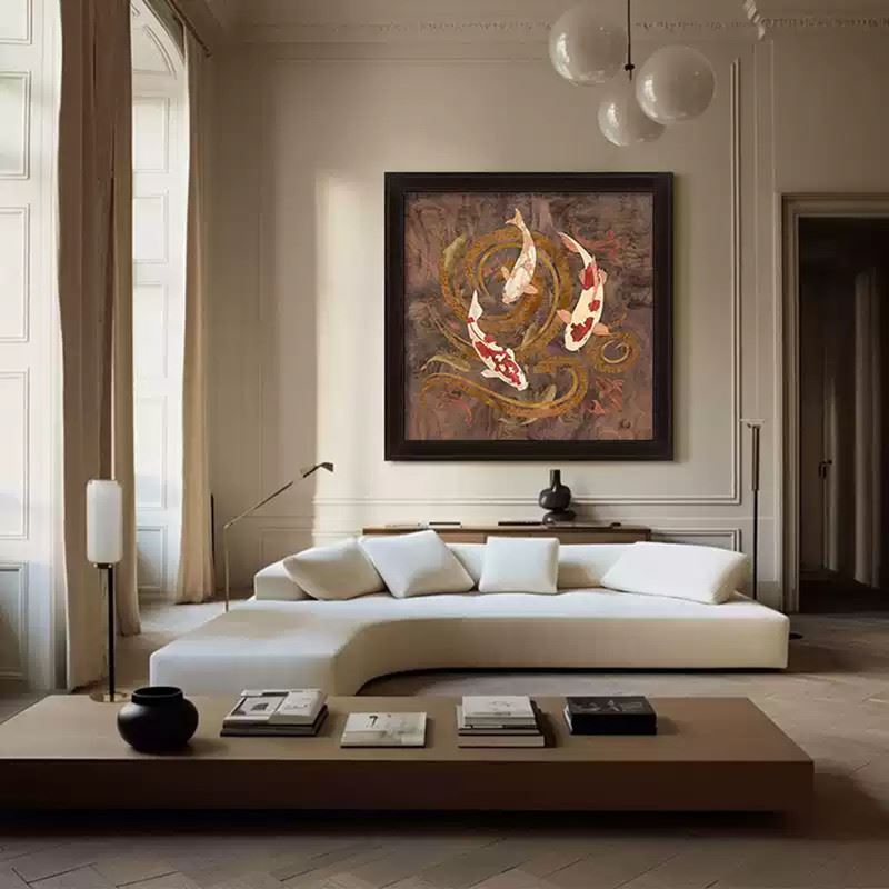 This artwork depicts several koi fish swimming gracefully through water with delicate lines and soft tones. The flowing curves of the water and the shapes of the koi intertwine, showcasing a harmonious blend of tranquility and vitality. Dimensions: 28 x 28 inches.