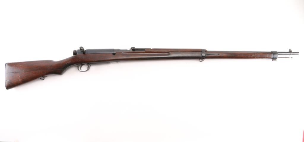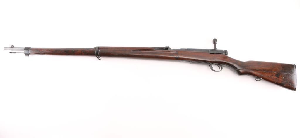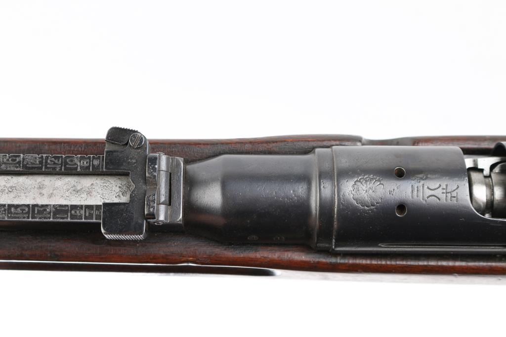 'Arisaka' Japanese military bolt action rifle, circa 1906-35. Mostly intact Chrysanthemum. Features blued finish, wood stock with finger grooves & curved grip, wood handguard, 31" barrel, blade front sight, folding ladder rear sight with "V" notch, floorplate release button inside triggerguard, manual safety, cleaning rod under barrel (shortened rod - not full length), bayonet lug. Bore is fair to good condition, a bit dark, frosted, with strong rifling. Retains 90% re-blued finish, showing blemishes underneath, markings partially eroded & shallow. Wood is good condition, sanded & refinished in a dark walnut color, plug repairs in several places, visible gap in dovetail join in butt. Buttplate has been filed to fit. Mismatched bolt. Dust cover number removed. Condition is NRA Good++ as refinished *** C&R Firearm ***