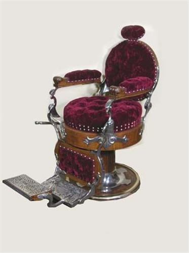 Koken barber chair, round seat & round back. Oak with crushed velvet, button tuft upholstery. All re-nickeled like new cond. Works.