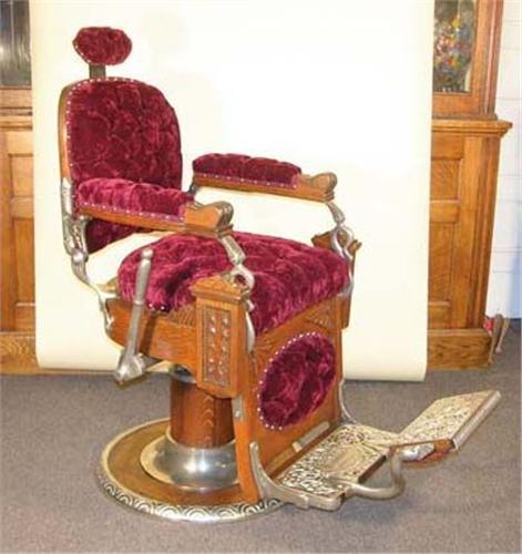 Koken barber chair. Beautifully restored to like new cond. Oak and button tufted crusted velvet.