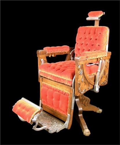 Koken Barber oak chair w/ carved design on sides & base, w/ brass covered paw feet.
