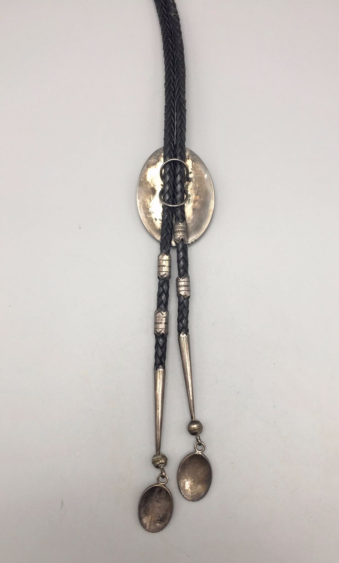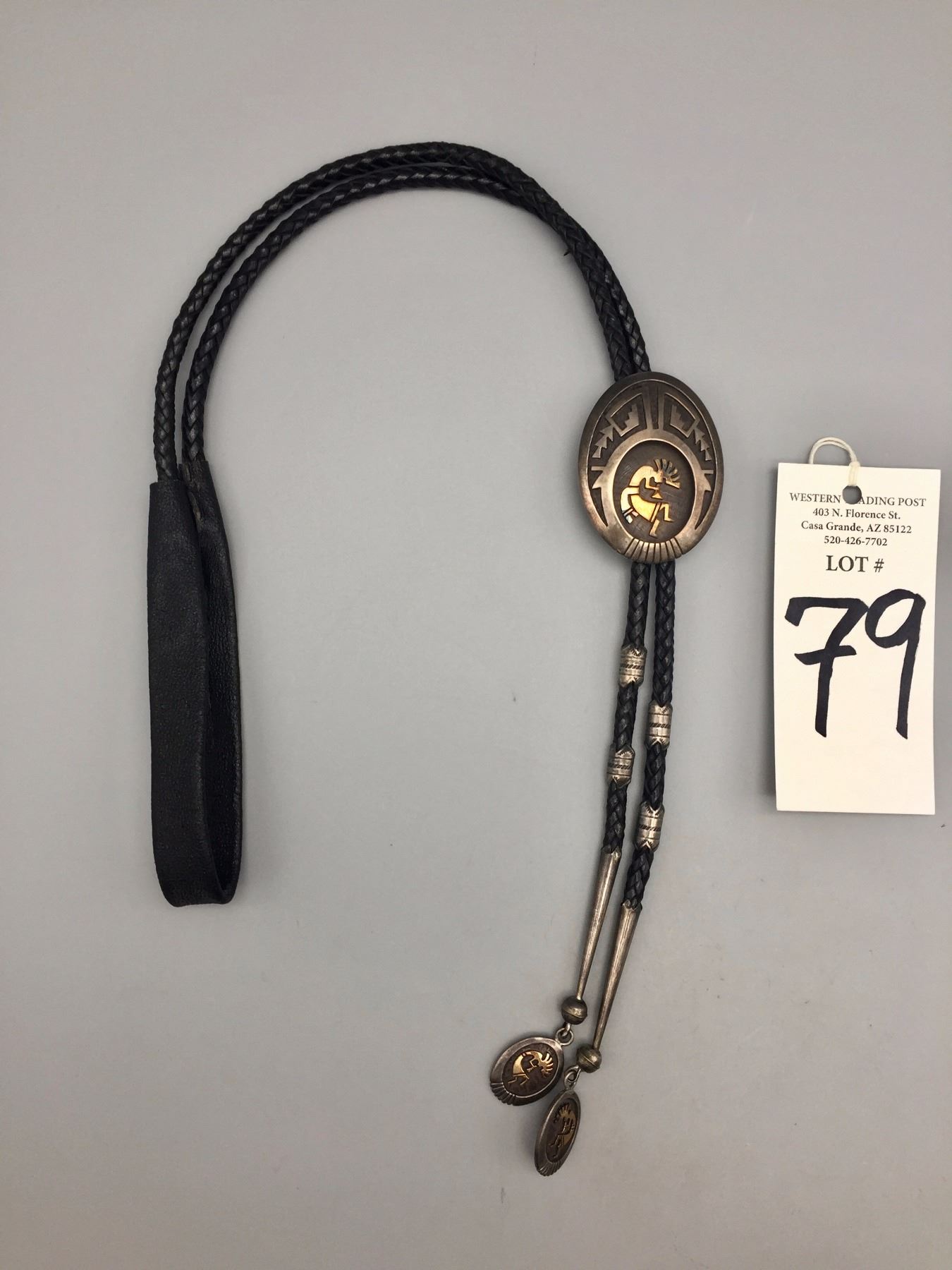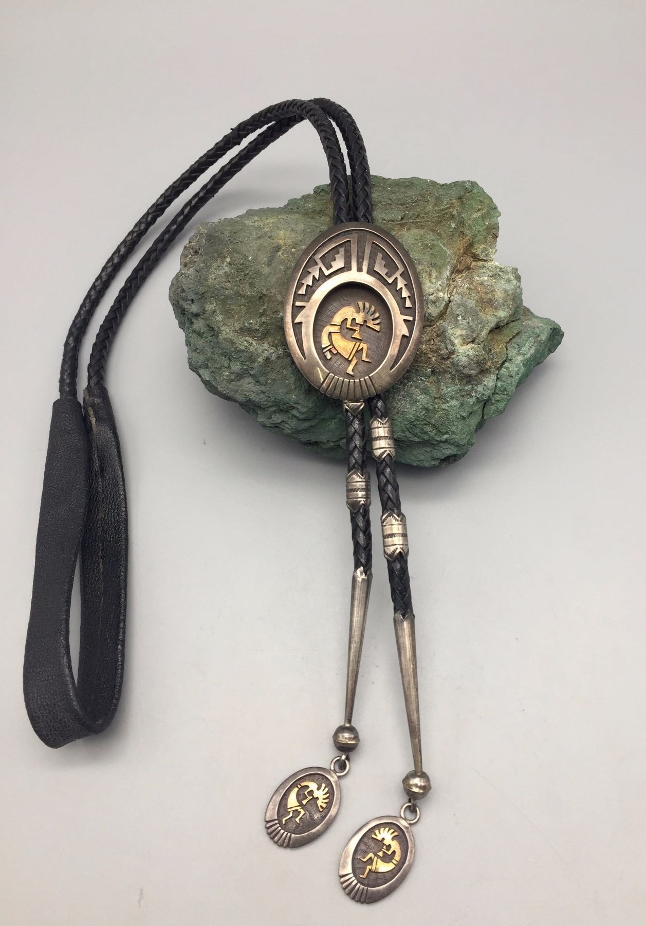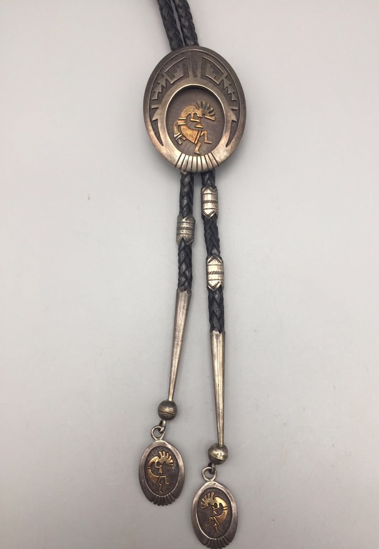 Maker: Hallmarked HY Sterling 14K. Mark of Hubert Yowytewa, Hopi. Approx. Age: Circa 1980s to modern. Size: Slide measures approx. 1 3/4” w x 2 3/8” h. on a 44” cord. Weighs 92.3 with most of cord on scale. Additional Info: Sterling silver overlay bolo with 14K gold Kokopelli in center of the slide and on both tips. Cord is a nicer than normal, braided black leather. Condition: Good for it’s age, normal wear expected. Please look closely at the pictures - they are an important part of our description. Shipping: There will be a $5 handling / packaging fee for shipping this lot. The actual cost of postage will be added on top of that.