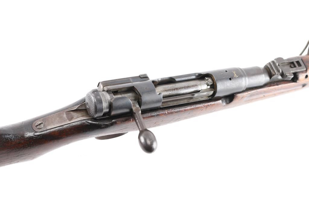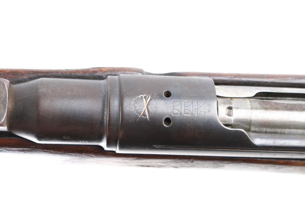 "Cavalry Carbine". second variation, with one hole for cleaning rod. Produced 1911-1942. Entered service in 1912, the 44th year of the Meiji reign, Type 44. Mostly intact Chrysanthemum with an X cut. Three Japanese characters on the chamber translate to "Type 44", Japanese military bolt action rifle features 19" barrel, protected blade front sight, V notch rear sight with flip-up elevator ladder, straight bolt handle, folding spike bayonet, butt compartment, side mounted sling swivels, manual safety, hinged floorplate. Hook located below the front sight on the right side, replicating the quillon of the type 30 bayonet for bayonet fencing techniques of the period, and for stacking. Mismatched serial numbers. Bore rough/frosted with rifling present. Retains about 70% dull blued finish, bottom metal has turned a brown patina, buttplate is missing the bottom screw and is a little proud of the wood. Wood is good condition with some small scrapes, scratches & dents, Observed markings are a little faint. NRA Condition-Good. C&R Firearm.