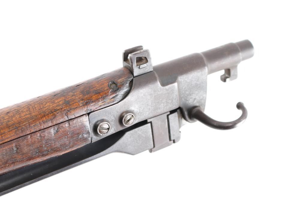 GOOD: Some minor replacement parts; metal smoothly rusted or lightly pitted in places, cleaned or re-blued; principal letters, numerals and design on metal legible; wood refinished, scratched bruised or minor cracks repaired; in good working order.