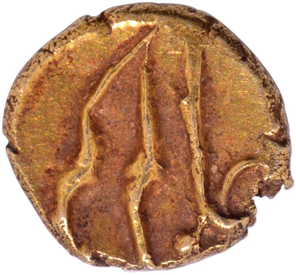 Alamgir II (AH 1167-1173/1754-1759 AD),KolarMint, Gold Fanam,Obv: Persian legend Alamgir, Rev: Persian legend Kolar, 0.4g, 6.34mm, (Herrli# 8.07.18), about extremely fine.