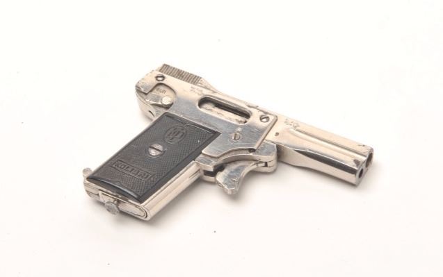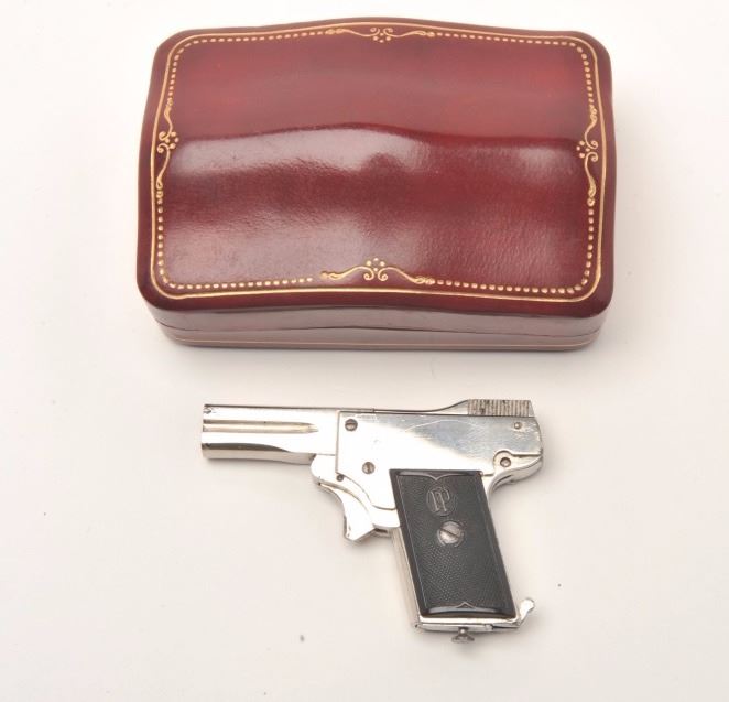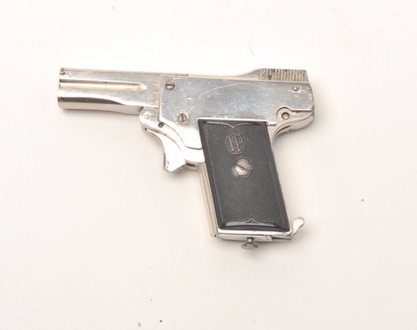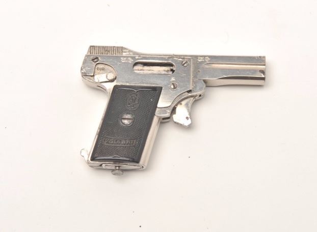 Kolibri 2.5mm Semi-Auto miniature pistol with rare factory original nickel finish and hard rubber grips showing logo. Fully operational and firing these circa 1920s oddities were made as a novelty and qualify as “firearmscuriosa”. Measures only 3” overall with less than 1 ½” barrel. About ½ the size of a .22 or approximately .10 caliber. 95%-98% bright original nickel with almost perfect grips and only very slight beginning age. Desirable to auto collectors and curiosa specialists. A little gem. Est.: $2000-$4000
