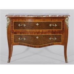 osztrák, 20. sz. elso fele, tölgyfa alapon mahagóni és topolyafa borítással, jávorfa berakással, öntött bronz fogantyúkkal és veretekkel, tetején márványlappal, sérült restaurált, 87*119*54 cm, sérült restaurált