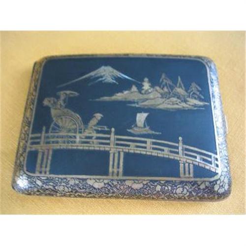 This Komai style rounded oblong cigarette case has no makers mark. A beautiful Damascan design of gold and silver the front panel has a center scene of a Geisha girl in rickshaw being pulled across a bridge with Mt.Fuji in the background, an Island and sailboat and a border of flowers. The interior has gilt metal cigarette restraints and the back center scene a has house amid trees with fisherman and a boat. In very good condition, there is minor wear but no chips or dings and it measures 3 1/4 inches high, 4 1/4 inches wide and 5/8 inch deep. A wonderful addition to any Vintage Cigarette Case Collection.