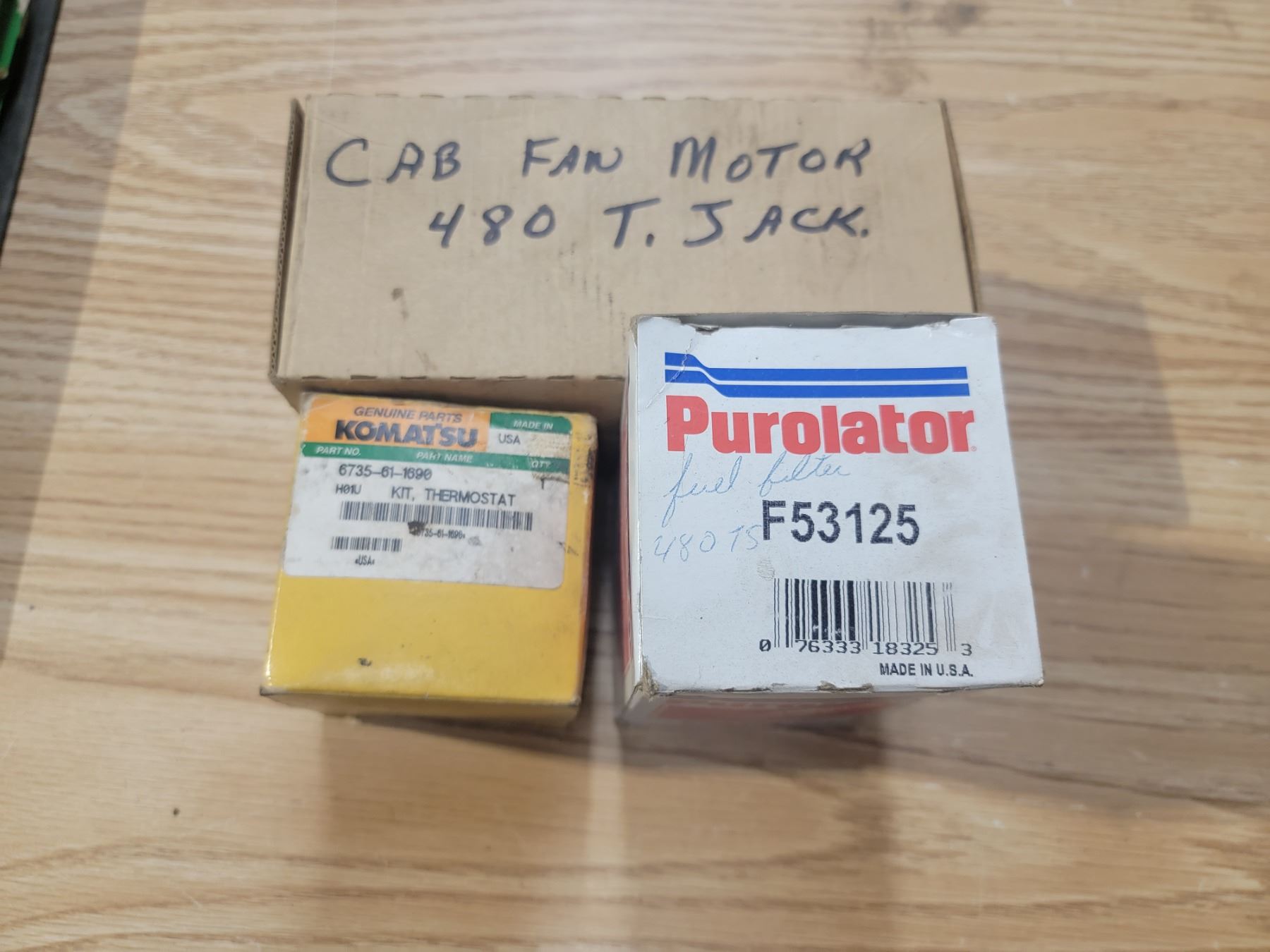 Komatsu loader parts - cab fan motor, thermostat, fuel filter