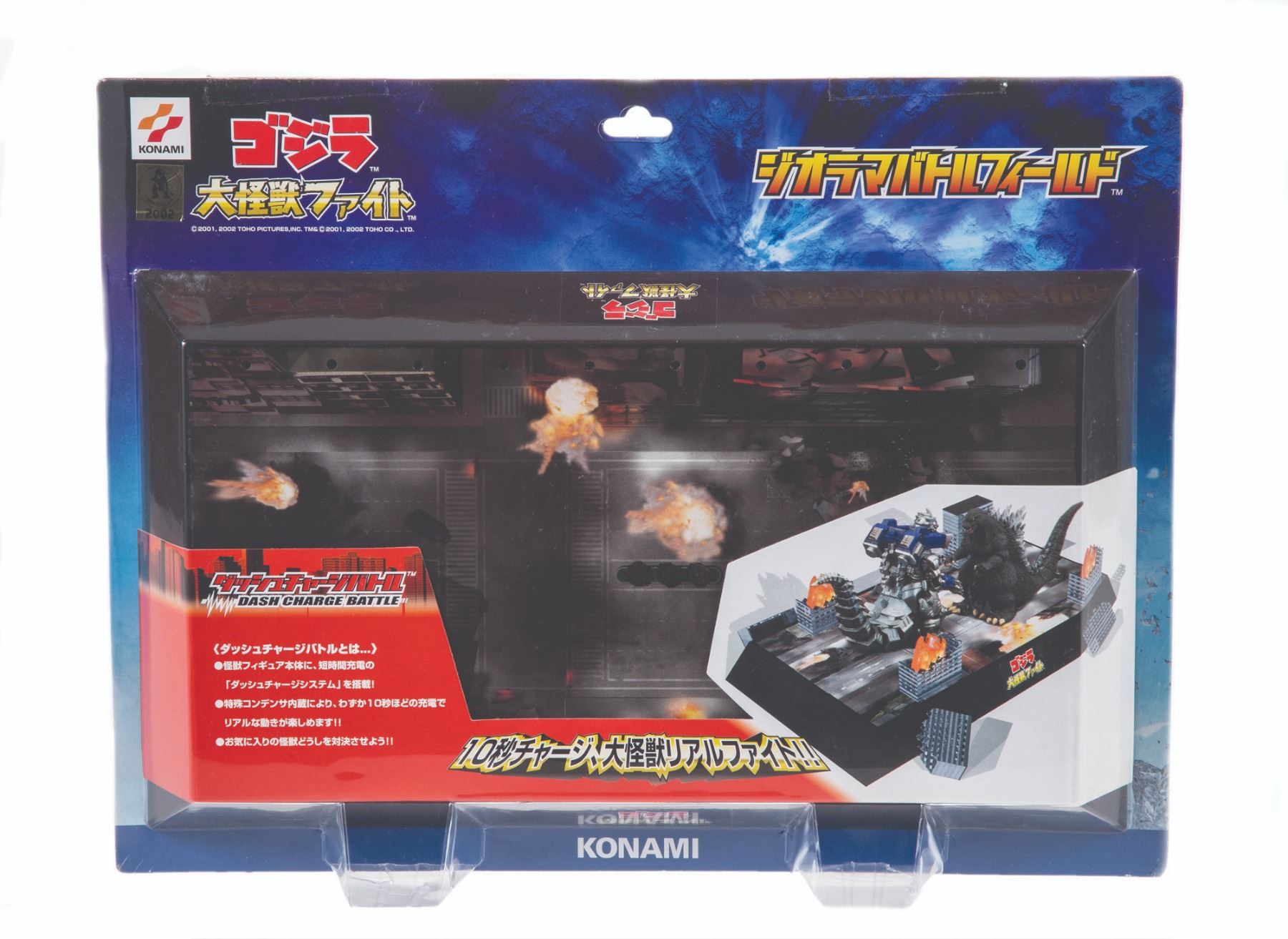 2001. Konami Godzilla Dash Charge Battle Diorama Battlefield. 7. 5”x11. 5”x1. 5”. VG+ Blister is cracked on bottom/unopened.