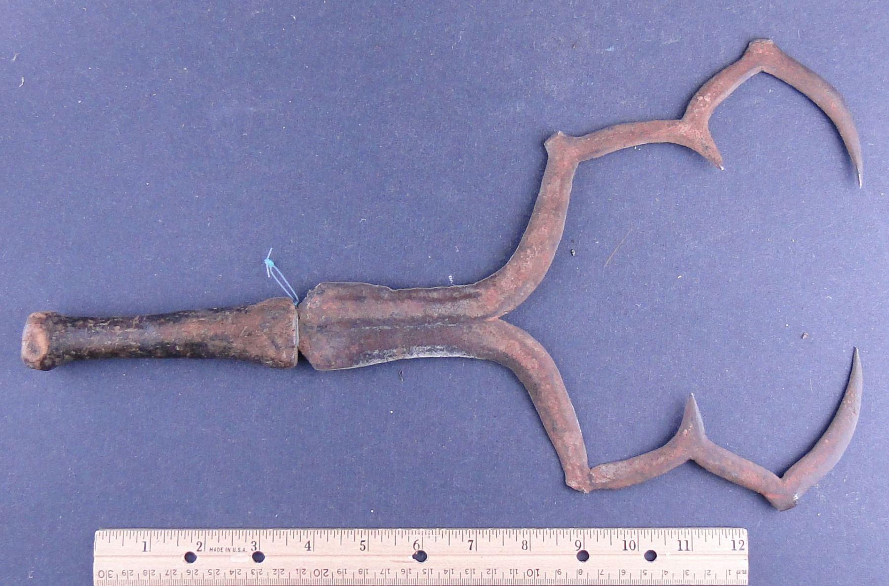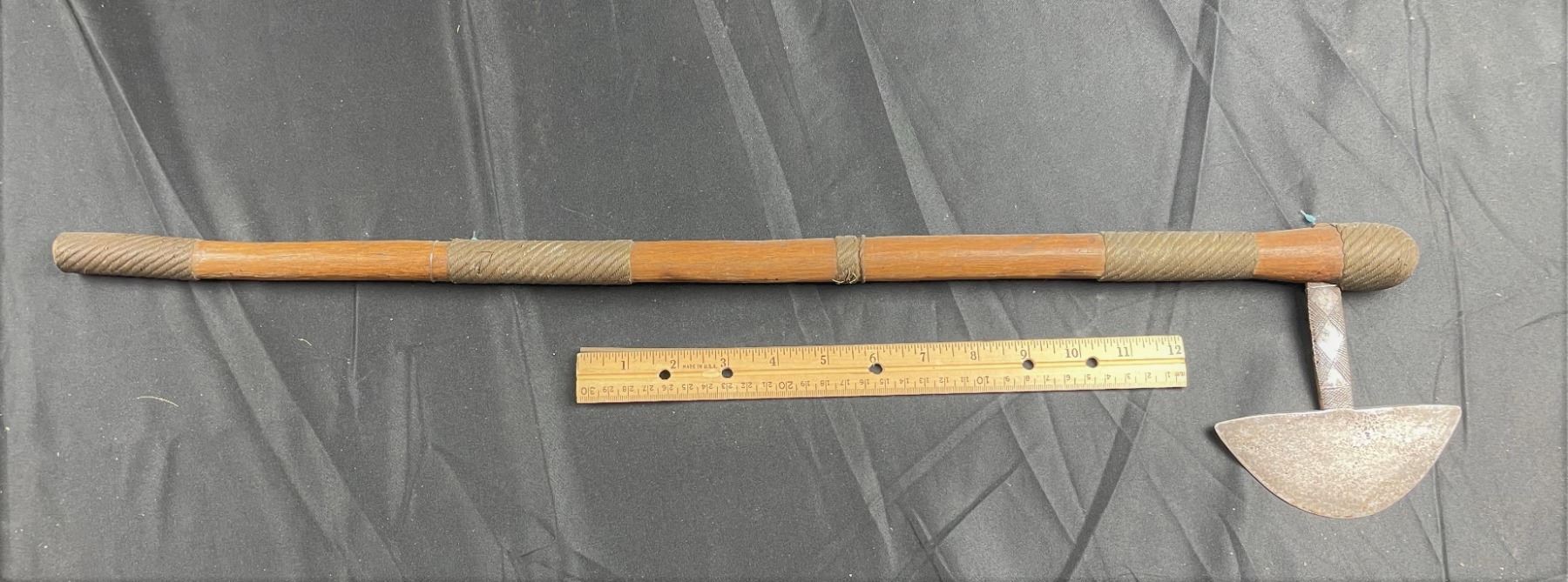 Description: Two further examples of exotic African knife money comprise this lot: (1) A double-pronged knife of the Konda Tribe, worthless as a weapon and used only in dances and as currency. See Opitz, pp. 181-83 (this piece illustrated on p. 183). (2) An axelike "knife" or hatchet with wire bindings over portions of the wood handle, used by the Zulu Tribe of South Africa. See Opitz, pp. 186-87.
