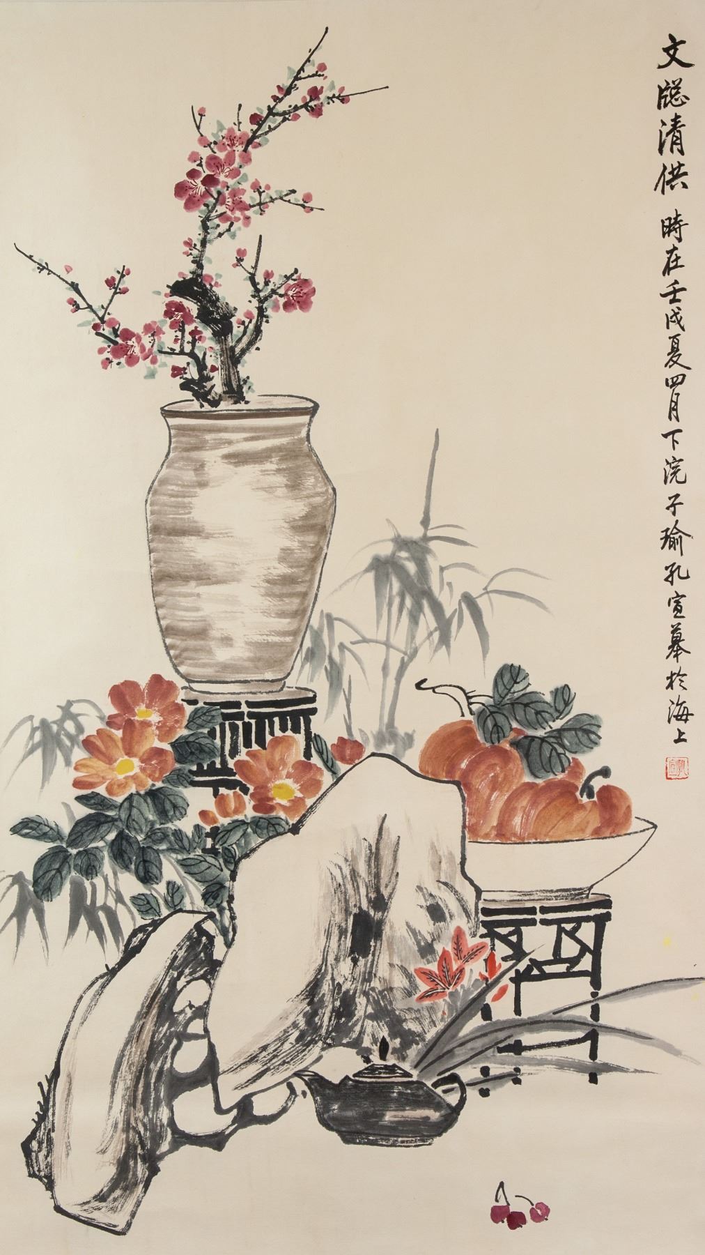 Ink and watercolor on paper, hanging scroll. Featuring still life painting of plum flower, vase, fruit and rock. Signed Kong Ziyu (1873-1926, Chinese), inscribed with 1 artist seal. 95 x 55 cm