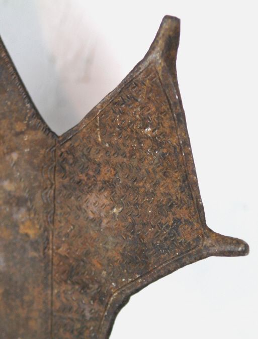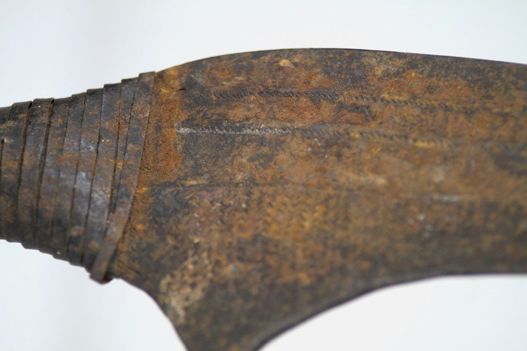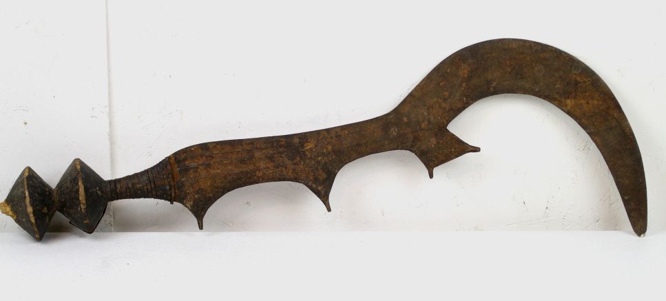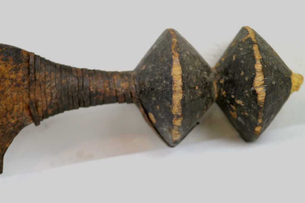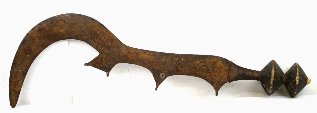 Kongo Executioner Sword 1800's - This is from the Kingdom of Congo a rule that ruled the west central Africa. This piece was used as a Executioner Sword. The blade is all hand made with intricate designs across the entire piece. This features two wood pieces on the edge of the handle, the handle is wrapped in iron, the sword has 4 prongs and the edge swoops forward. The Blade is sharpened on teh outside edge. This piece dates older than 1890's and the exact age is unknown. Measures 30" long, the top swoop is 10" wide, and the blade is between 1.75"-4.5" wide throughout the sword.
