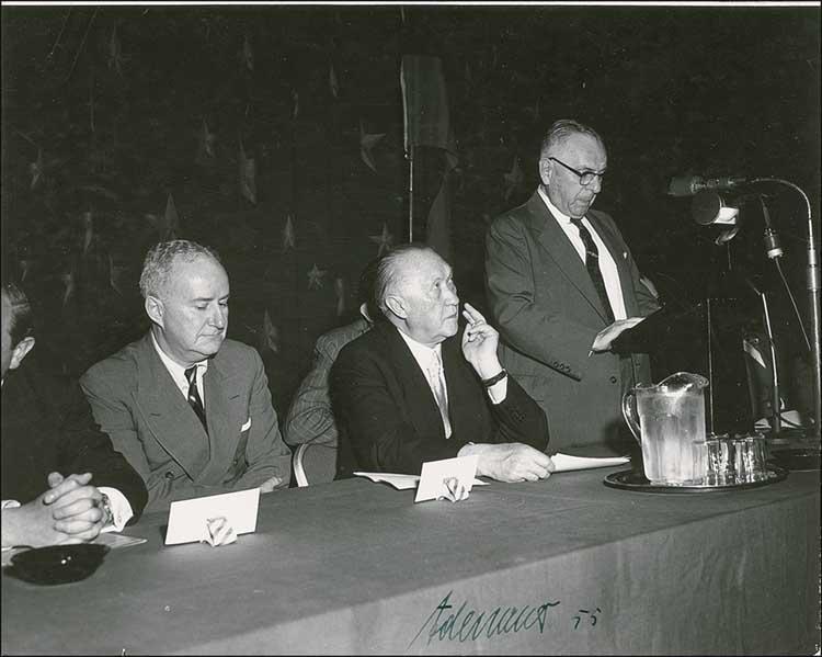 First Chancellor of West Germany (1876-1967). Vintage glossy 9.5 x 7.5 photo of Adenauer at a conference, signed in fountain pen. Photo is affixed to an identical size card. Paperclip impression to top edge, lightly trimmed edges, and some scattered light surface marks, otherwise fine condition. RRAuction COA.