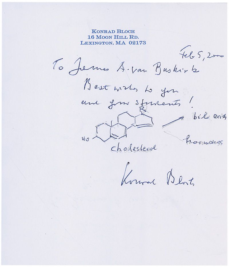 Biochemist (1912–2000) who shared the 1964 Nobel Prize in Medicine or Physiology for discoveries concerning cholesterol and fatty acid metabolism. ALS, one page, 6 x 7, February 5, 2000. A sketch of the metabolization of cholesterol with a brief letter to a teacher. In full: “Best wishes to you and your students!” In fine condition, with a crease to the upper right and remnants of a pencil sketch underneath the final product. Accompanied by the original mailing envelope.