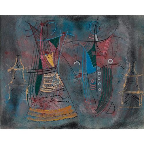 Konrad Cramer (German/American, 1888-1963), "Untitled", c. 1954; casein/paper, 16" x 20", unsigned; estate stamp,label on verso from Fletcher Gallery, Woodstock, NY, accompanied by letter from the artist’s son. Cramer came to the U.S. in 1911, and became