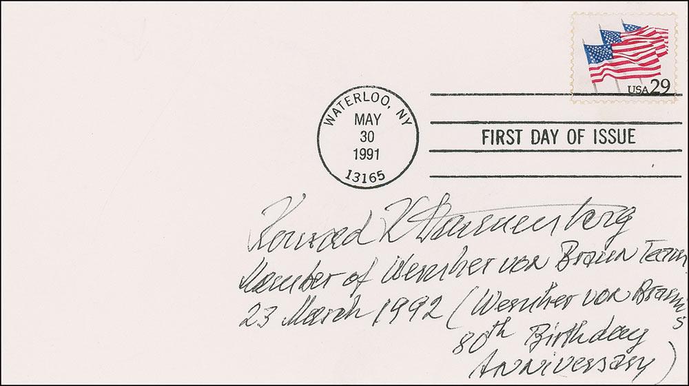 FDC, signed on the front in black ballpoint, “Konrad K. Dannenberg, member of Wernher von Braun team, 23 March 1992 (Wernher von Braun’s 80th birthday anniversary).” In very fine condition.