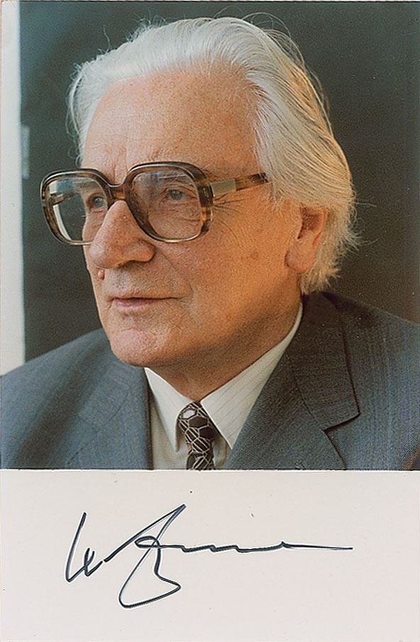 German civil engineer, inventor and computer pioneer (1910–1995) whose Turing-complete Z3 is considered the world's first programmable computer. Color satin-finish 3.5 x 5.25 photo of Zuse in a suit and tie, signed in the lower border in black felt tip. In fine condition, with a light diagonal surface scuff.
