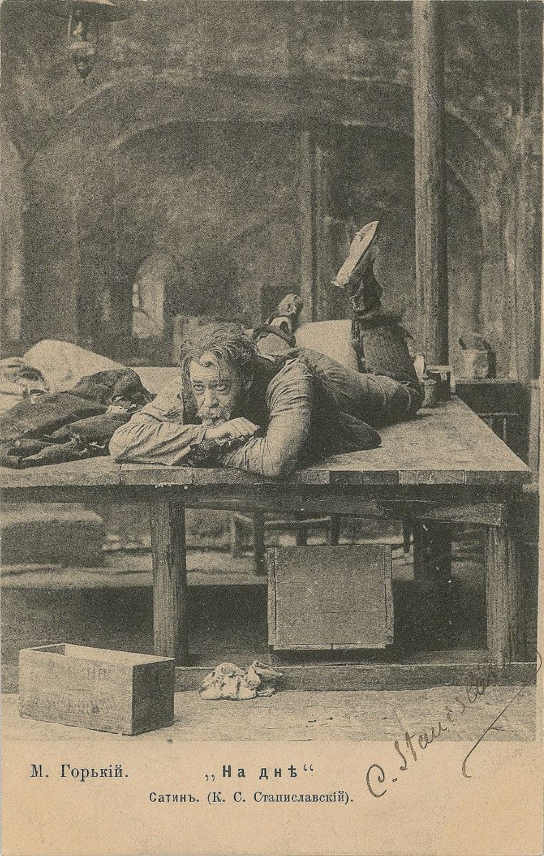 Russian actor and theatre director (1863–1938) whose techniques and methods have become incredibly influential in modern film and theatre. Desirable circa 1903 Russian postcard photo of Stanislavsky posing as a dejected beggar, 3.5 x 5.5, signed on the front in black ink, “C. Stanislavsky.” In fine condition.