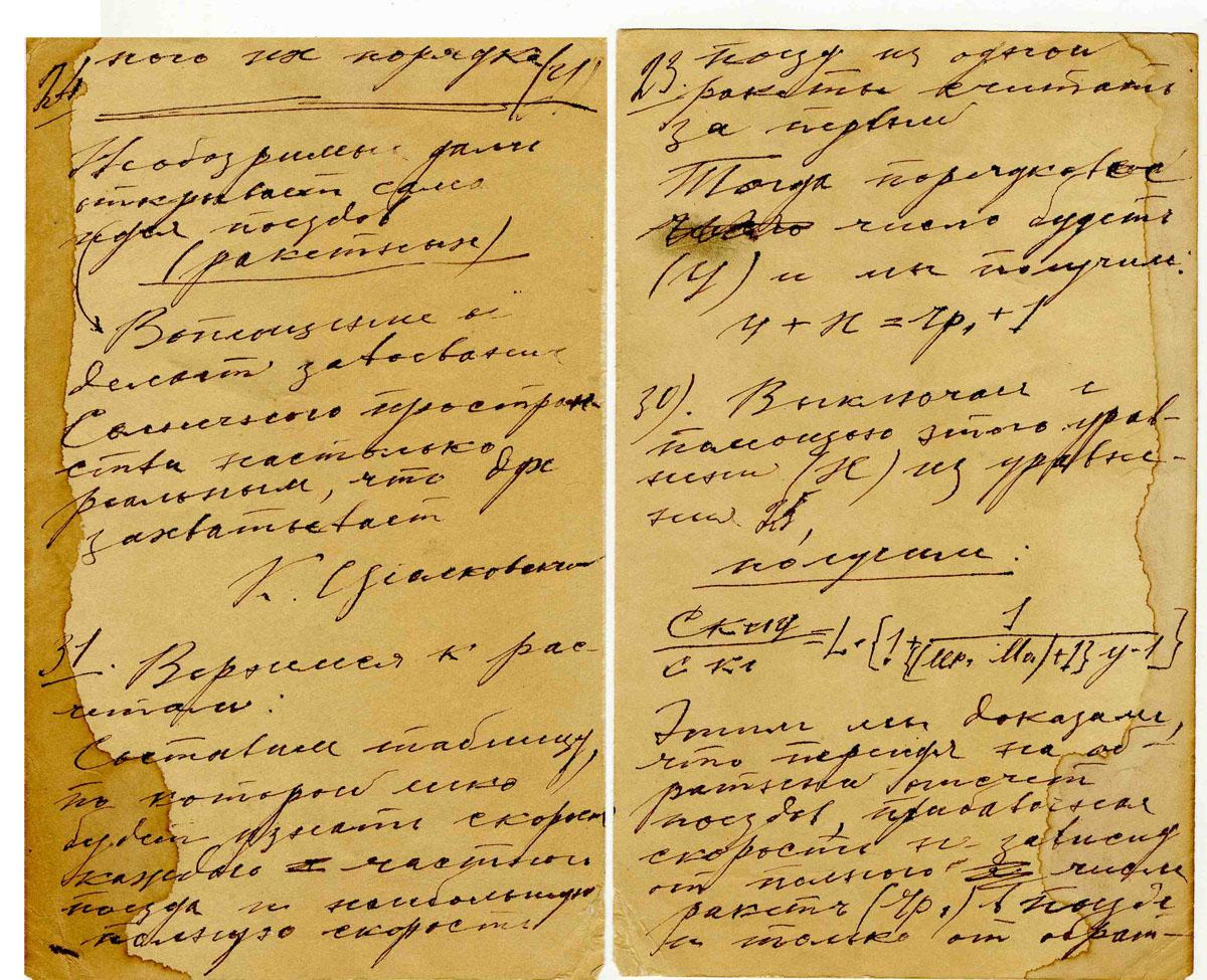 Konstantin Tsiolkovsky partial document signed, written entirely in his hand, on the subject of a rocket's speed in flight. In Russian, untranslated, but bearing mathematical calculations indicating content. Two pages on one sheet measuring 4.75'' x 7.5'', undated. Damp stain to left edge, else very good condition. Rare item from the rocket designer who laid out the basic principles of modern space flight.