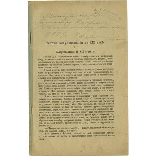 <B> Konstantin Tsiolkovsky Signed Pamphlet. </B></I> 10 pages, 6" x 9.5", entitled: (In Russian) <I>Aeronautics Before XIX Century,</B></I> np, February 4, 1901. Signed and inscribed at the top of the first page as, "<I>To dear Aleksander Petrovich Shaposhnikov from the author, 1901, February 4, Tsiolkovsky.</B></I>" Tsiolskovsky was a Russian physicist and astronautics scientist who pioneered rocket and space travel research. Self-educated and handicapped by deafness from the age of 10, his visionary ideas on the use of rockets for space exploration were published in 1903. In 1911 he developed the basic theory of rocketry and multistage rocket technology. The last lines of the first page of this pamphlet read, "<I>This is a legend about Gusman, who because of his flying apparatus almost fell into soft and pious hands of the Holy Inquisition.</B></I>" The pamphlet is in very fine condition; staples on the left edge have rusted slightly and stained the paper; some tears along left edge near staples.