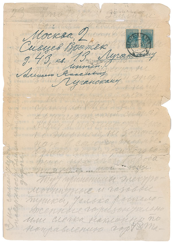 Unsigned partial manuscript in Tsiolkovsky’s hand, written in pencil (in Russian) on the reverse of an untranslated 8.25 x 11.5 typed sheet, no date, but postmarked February 18, 1933. In part (translated): “23…. Earth and Sun gravitation and provide access to all planets and alien suns of the Milky Way. It is known that a city tram is not moved by the energy accumulated in it, but, rather, by that which is coming to it from a stationary power station (1). As with smoke, an artillery shell flies and rises high using energy that has not been accumulated in the shell proper. In a word, we are talking about a way of throwing an interstellar cabin. Electromagnetic and gas cannons may be applied here, but placed horizontally or with a slight tilt in the direction of the mountains (2). (1) by wire. (2) on the hardest surface of the Earth or on a road paved on it….” On the top third of the sheet, over his pencil writing, Tsiolkovsky has addressed the manuscript in ink to Lugansky Engineer Aleksey Yakovlevich Lugansky, 43 Sivtsev Vrazhek, Apt. 13 Moscow, 2. In good condition, with scattered soiling, tears and small holes, edge wear with small chips, part of the text obscured by address as noted above, and much of the pencil writing on the light side but generally legible. Interesting scientific content!